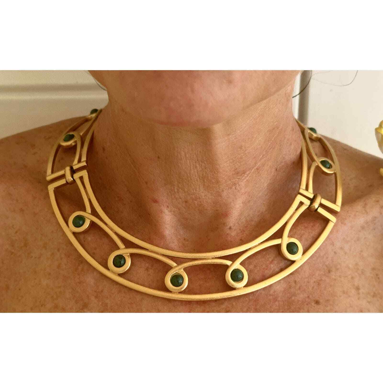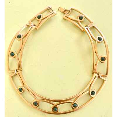 Stunning Etruscan 80s VTG Monet Satin Gold Linked Collar Necklace Green Beads