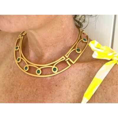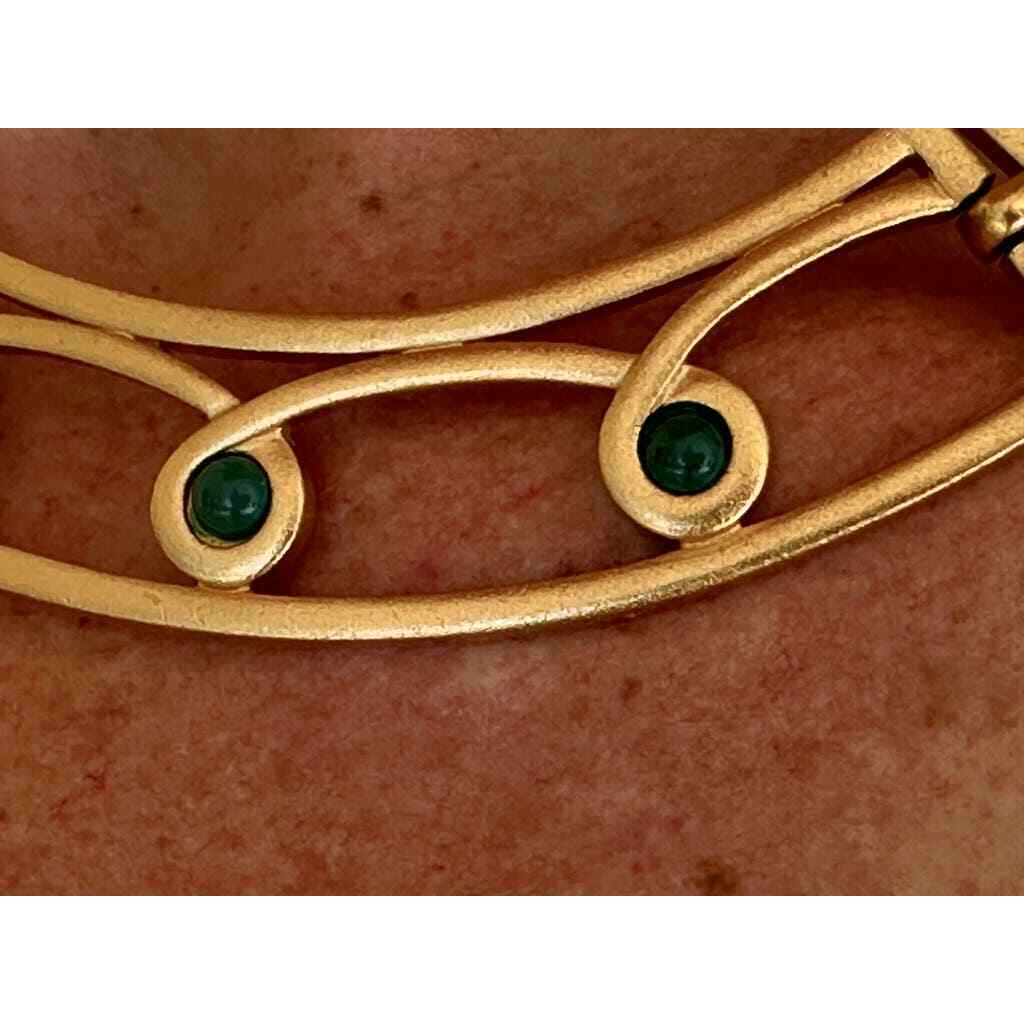 This stunning signed vintage Monet Etruscan necklace is a rare find! It's well made in brushed gold with a nice weight and drape. Whether you see Egyptian Revival, NeoClassical, Greek, or Art Deco, you'll project high fashion and elegance. The necklace is about 18 1/2" and finished in soft satin goldtone metal with green cabochons.