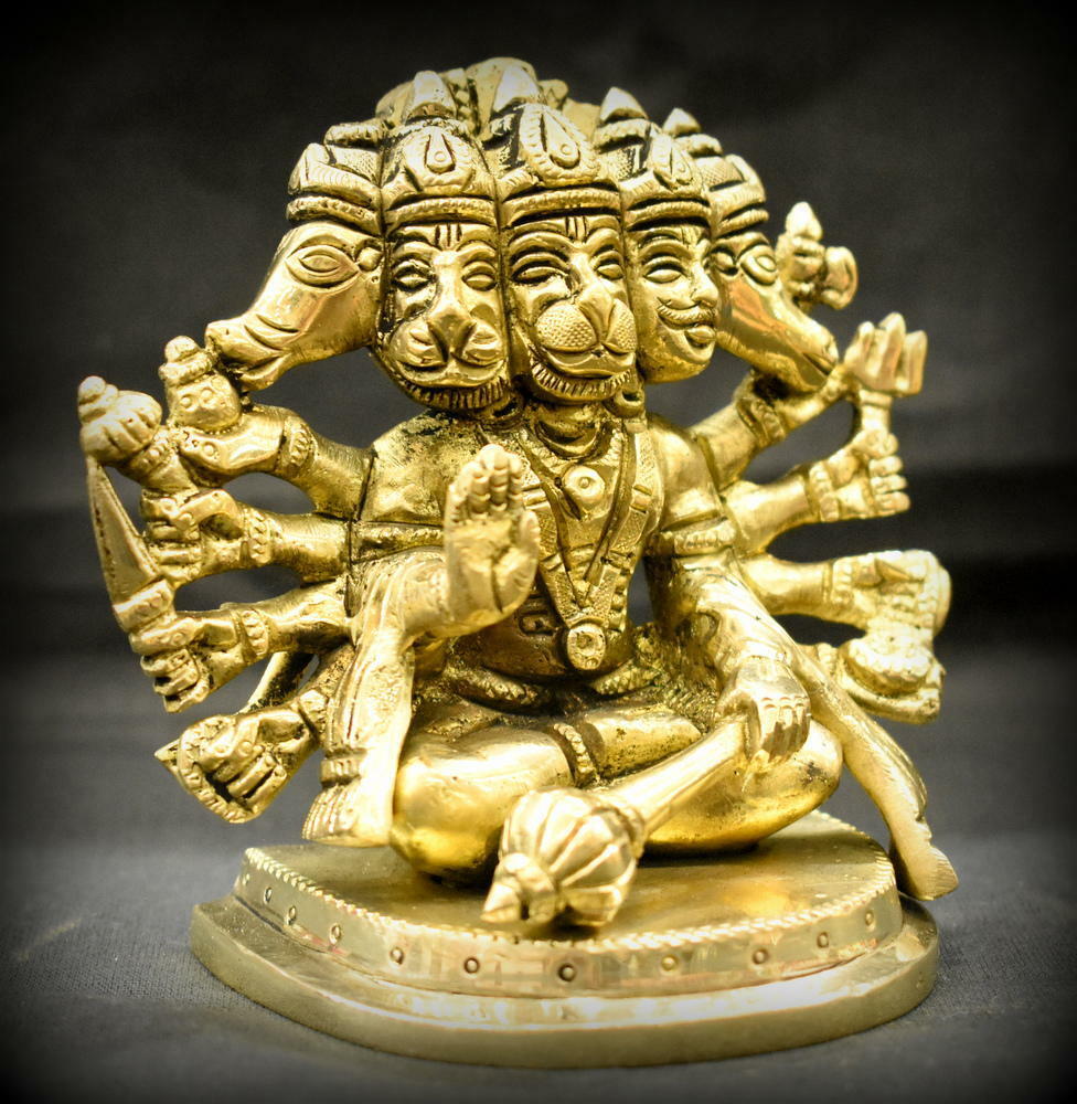 Dimension : Panchmukhi Hanuman is Made in heavy shining brass in sitting position . He is having 10 hands holding weapons to assure protection to his devotees from all danger and evil . The five heads represent the Hayagriva , Narsimha , Garuda , Varaha , Hanuman . It is said that