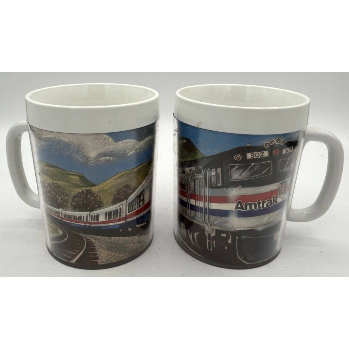 2pcs Vtg Thermo-Serv 12oz Plastic Travel Mugs AMTRAK Train Winding Through Hills