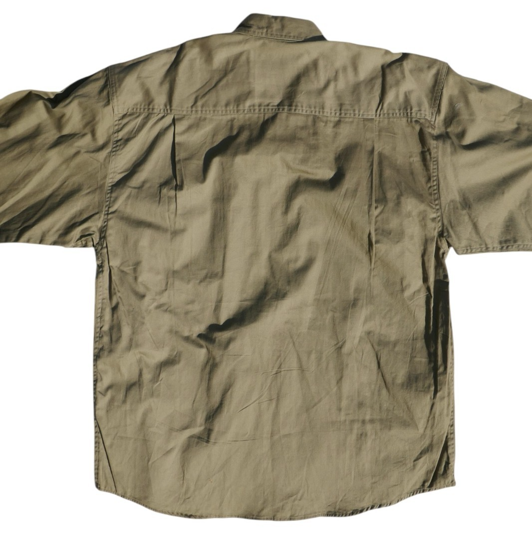 The Master Sportsman Shooting Hunting Rugged Outdoor Beige Khaki Shirt is a versatile and durable piece of clothing perfect for outdoor activities. This measures approx. 26" from pit to pit and 33" from shoulder to bottom hem. Made from a blended fabric of polyester and cotton, this shirt features a collared neckline and button closure for added style and functionality.