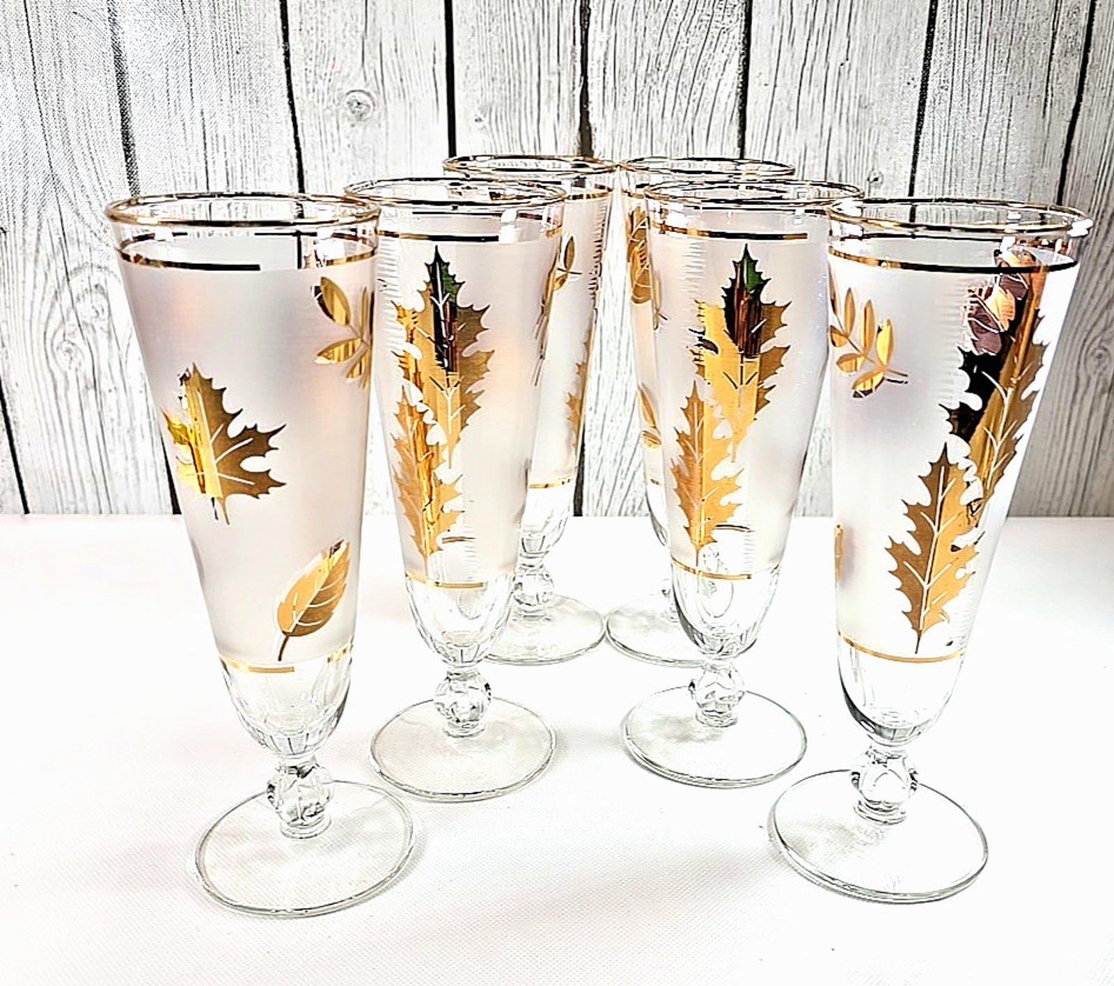 Libbey Gold Leaf Pilsner Glasses Set of 6 12oz MCM Beer Barware USA VTG