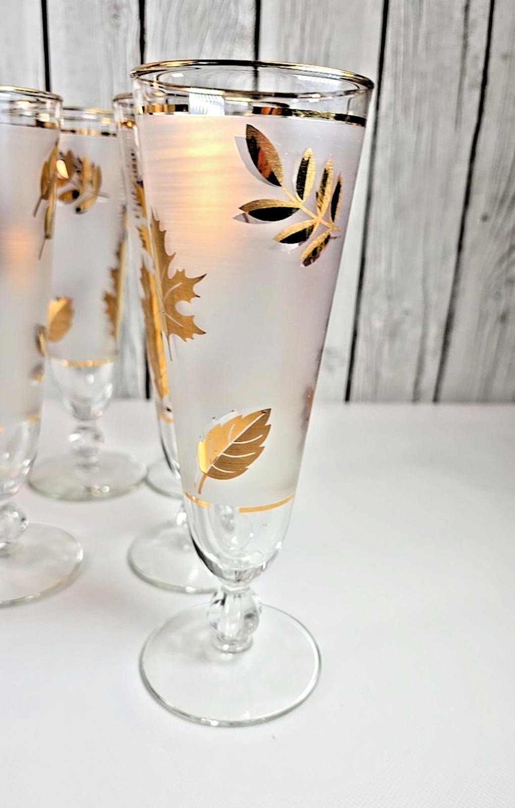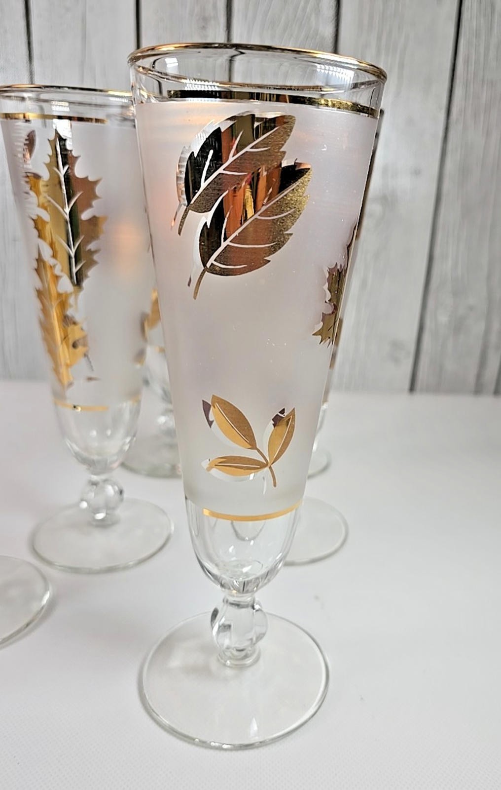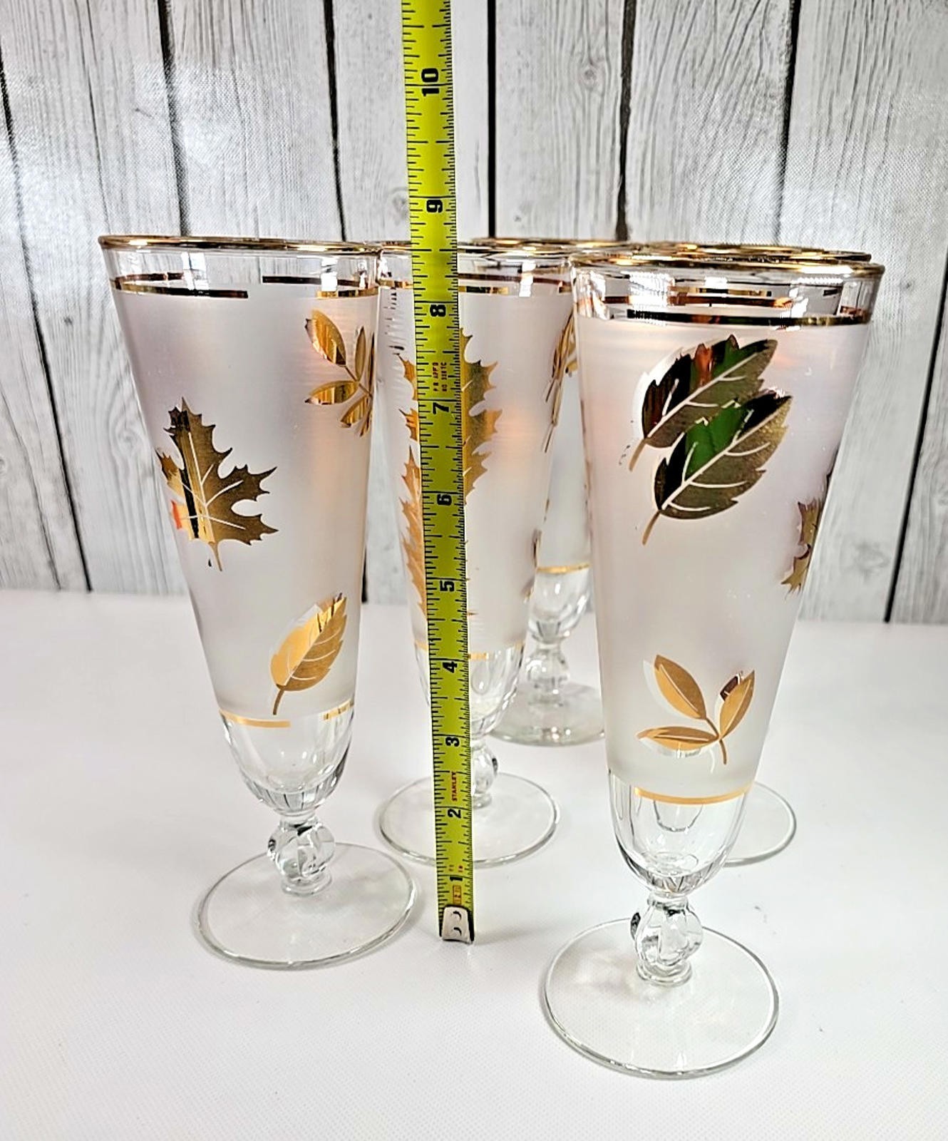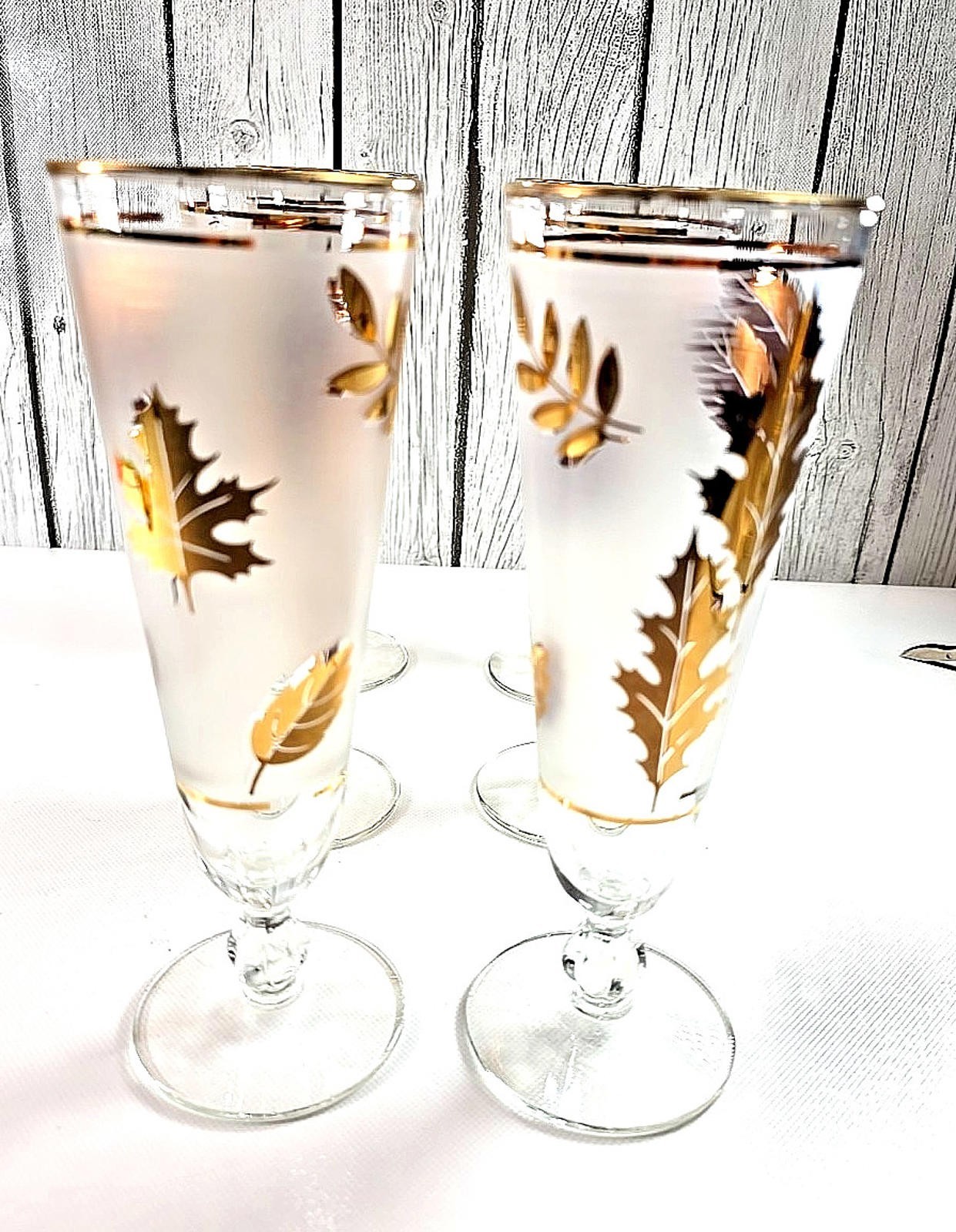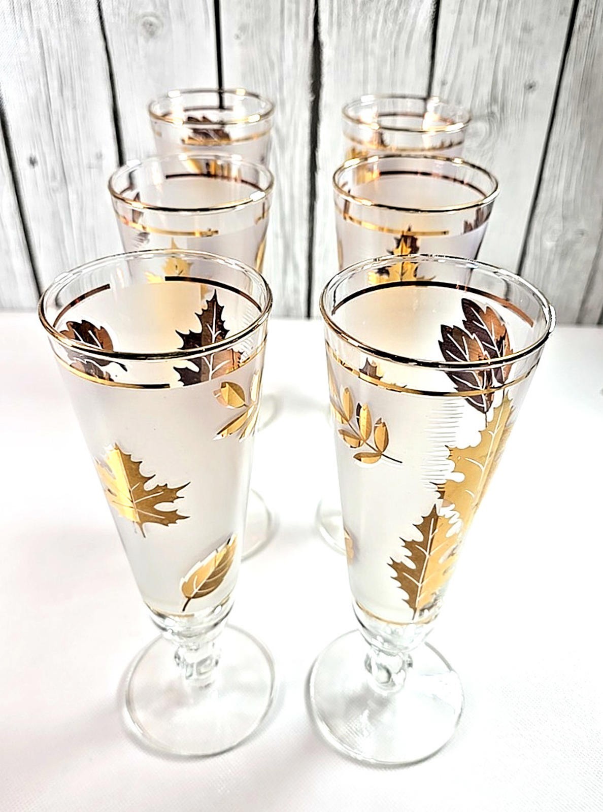 This Mid Century Modern Libbey pilsner glass set includes six 12oz glasses with frosted sides and 22k gold foliage designs. A timeless American barware set perfect for vintage entertaining.