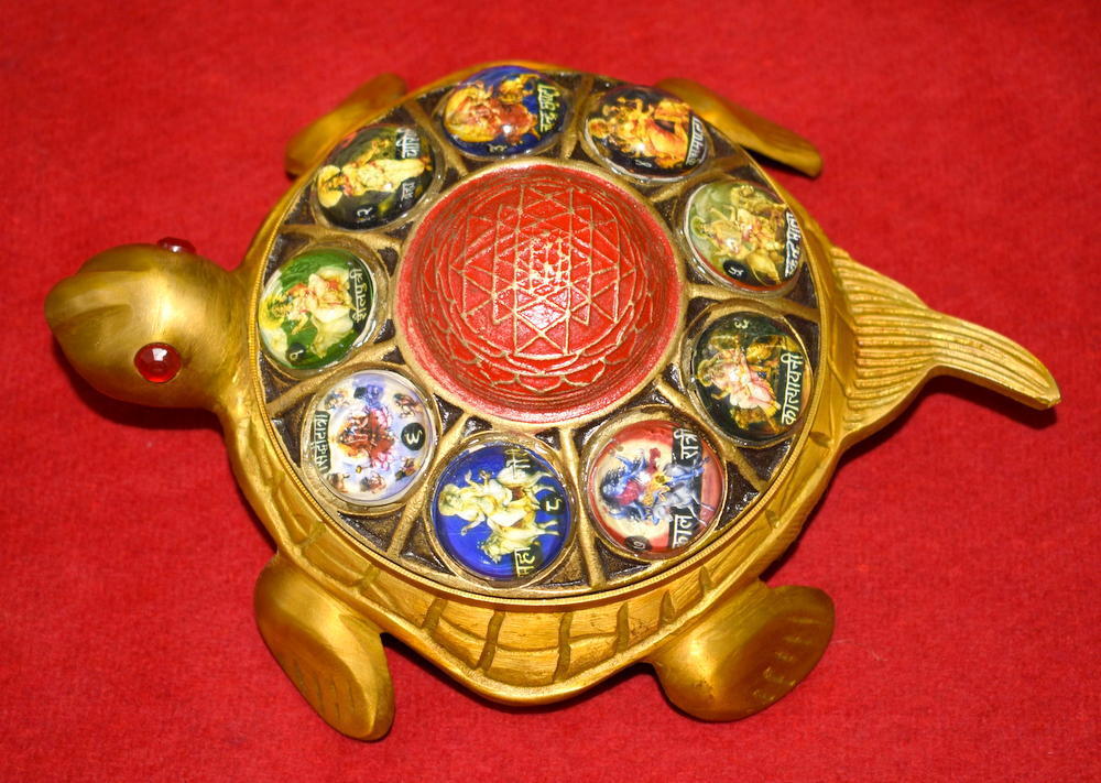 Product Name : Shree Nav Durga Yantra On Tortoise on Tortoise Dimension : 8 inches (Length) * 5.5 inches (width) Weight : 800 gm (approx) Design : Beautiful NavDurga Yantra on heavy Panchdhatu Tortoise. Description : Navdurga Yantra exquisitely portrayed in centre with the 9 forms of all round the yantra. Yantra and Nav Durga framed on a crystal glass that allows magnified view . It is also a powerful Yantra for attaining desires, removing difficulties and conquering enemies. Worship of this Yantra as per Adhayaya 4 sloka 17 of Durga Saptashati removes poverty. Nav Durga is the nine forms of existence or entities of Durga, the Goddess of vitality and power. The nomenclatures are Shailputri, Bhrahmacharini, Chandra Ghanta, Kooshmanda, Skandhamata, Katyayani, Kalaratri, Mahagowri, Siddhi