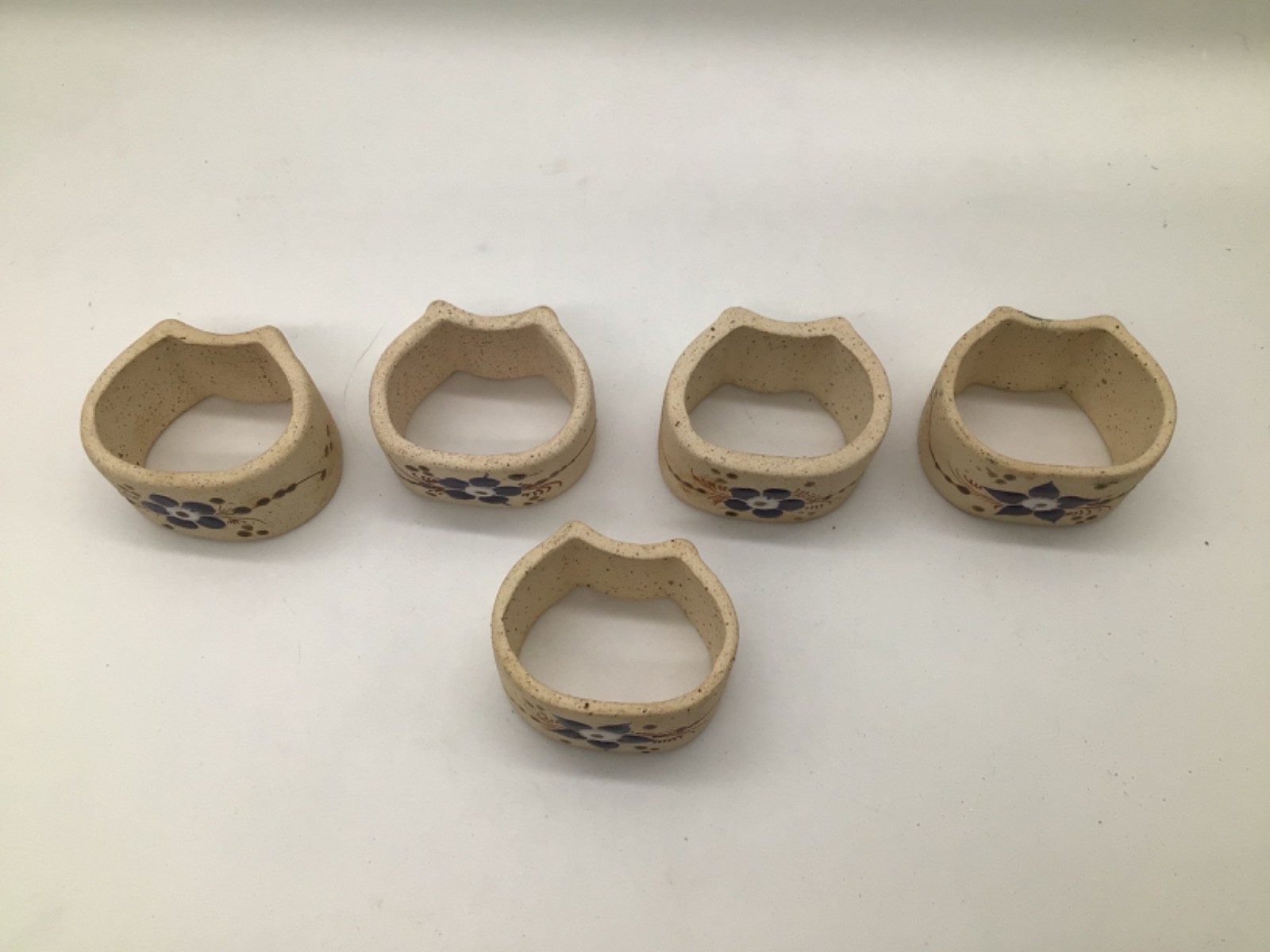 VINTAGE Hand Painted Stoneware Blue Floral Napkin Rings Set of 5 Rustic Pottery