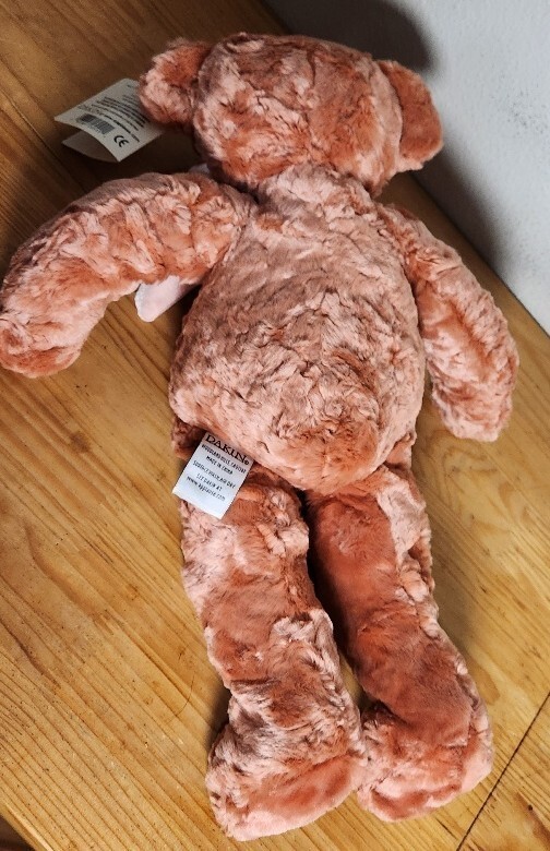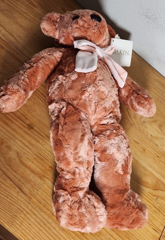 The Dakin Ginger Fashion Bear Plush is a 16-inch stuffed animal toy in a mauve salmon pink peach color. This adorable bear plush by Dakin is perfect for children and collectors alike. Its medium size makes it easy to cuddle and play with, while its cute design adds a touch of charm to any toy collection. The pink/salmon color adds a playful and fun element to this beloved stuffed animal toy.