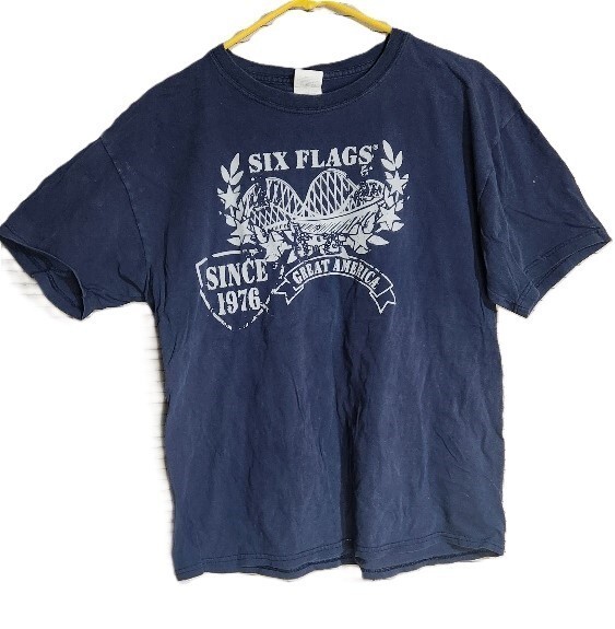 Celebrate an enduring symbol of fun and nostalgia with the Six Flags Great America Since 1976 Commemorative T-Shirt. Made by Gildan and belonging to their Heavy Cotton product line, this blue unisex medium (see size disclaimer below) T-shirt features a bold graphic print that pays homage to one of America's most iconic theme parks. Its versatile design is perfect for all seasons, whether you're planning a park visit or just looking for a casual, comfy layer.