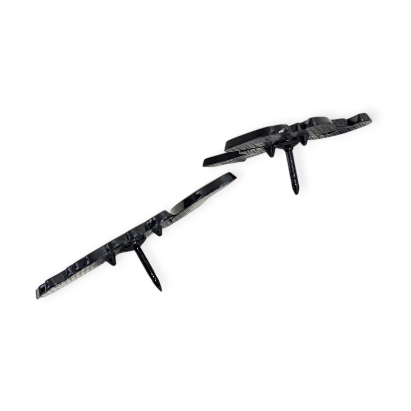 • Sculpted metal with enamel, and finished with rubber backs to keep secure.