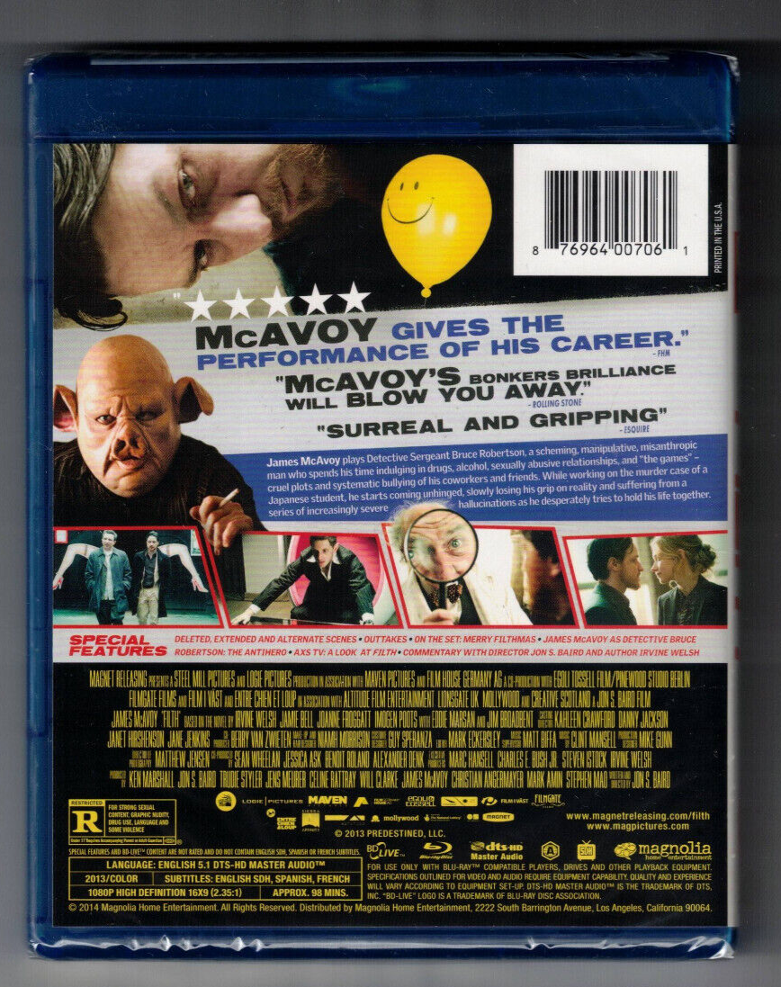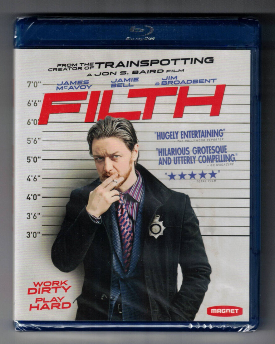 This is a Brand New, factory sealed Blu Ray of the 2013 crime comedy FILTH featuring James McAvoy (star of the recent hits Speak No Evil and Split). It's the original Blu Ray released by Magnet and comes in its original case, still factory sealed.