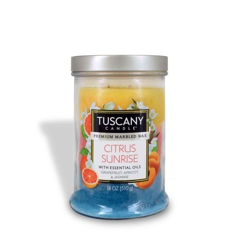 Energize your mornings with our ""Citrus Sunrise"" scented candle. This 18-oz dose of sunshine radiates a lively blend of grapefruit, apricot, and jasmine, turning any room into a haven of positivity and perfect for kickstarting your day. Poured in a tall, cylindrical glass jar, the three color-coordinated layers of marbled wax in this long-lasting candle add a touch of visual elegance to your surroundings. FRAGRANCE NOTES Grapefruit, Apricot, and Jasmine PRODUCT DETAILS The 18 oz Tuscany Classic Collection of scented candles offers dozens of powerhouse fragrances in elegant, approachable packages. Poured into tall glass jars with silver lids, each candle features the distinctive look of our premium marbled wax in various colors. These candles are loaded with essential oils, each featuring two lead-free wicks for an even burn experience. Volume: 18 oz, Width: 4, Length: 6, Jar Color: Clear, Wax Color: Yellow, Pink, Blue, Wax Type: Premium Marbled Wax with Essential Oils, # of Wicks: 2, Burn time: approximately 80 hours, Poured in the U.S.A.