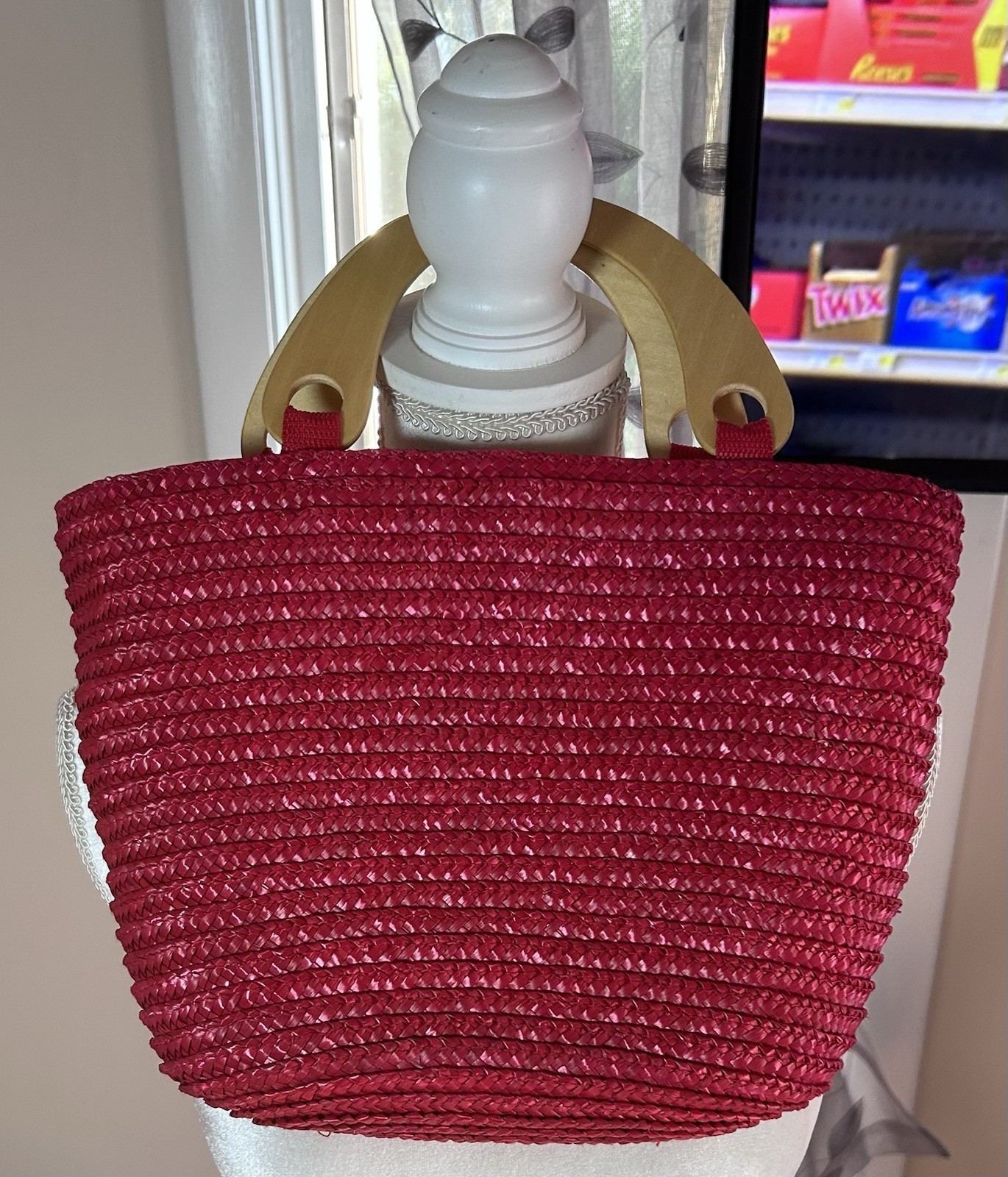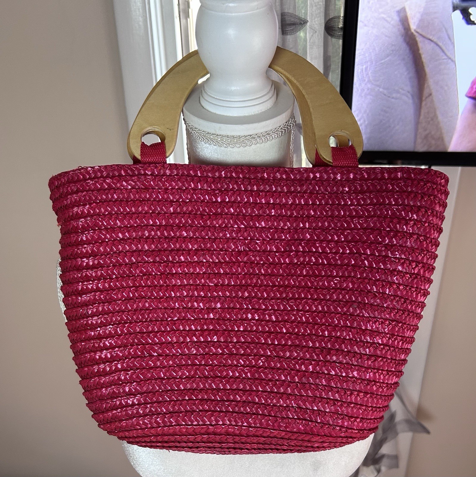 Vintage Y2k Early 2000’s Faded Glory Red Straw Purse Hand Bag Wooden Handles