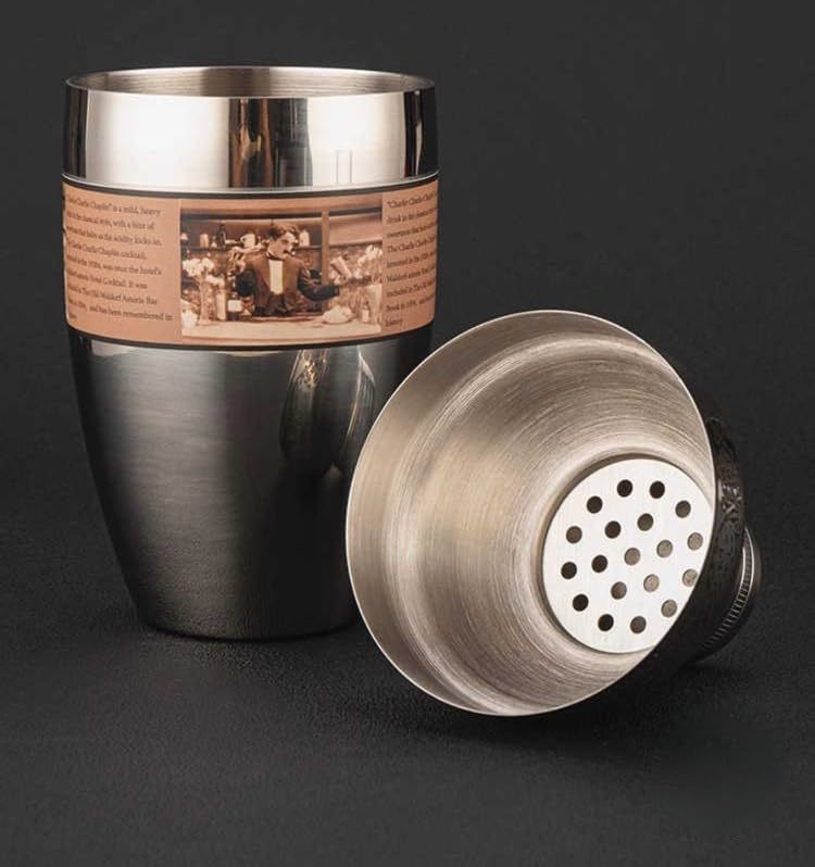 Product description: Transform your home bar experience with this professional-grade cocktail shaker featuring an eye-catching vintage print design. The 500ml capacity stainless steel shaker combines style and functionality, perfect for crafting single or double servings of your favorite cocktails. Its cobbler-style design includes three essential components - a main tumbler, a lid with integrated strainer, and a secure cap that work in harmony to prevent leaks during vigorous shaking. The built-in strainer features precisely engineered holes that expertly filter ice and muddled ingredients while ensuring smooth pouring. Measuring 3.3 inches in diameter and 7.7 inches in height, this shaker is thoughtfully sized for comfortable handling. The decorative band showcases classic bar scene imagery, making it both a functional tool and an attractive addition to any bar cart. The durable stainless steel construction maintains optimal temperature control while mixing and ensures lasting performance through countless cocktail crafting sessions.