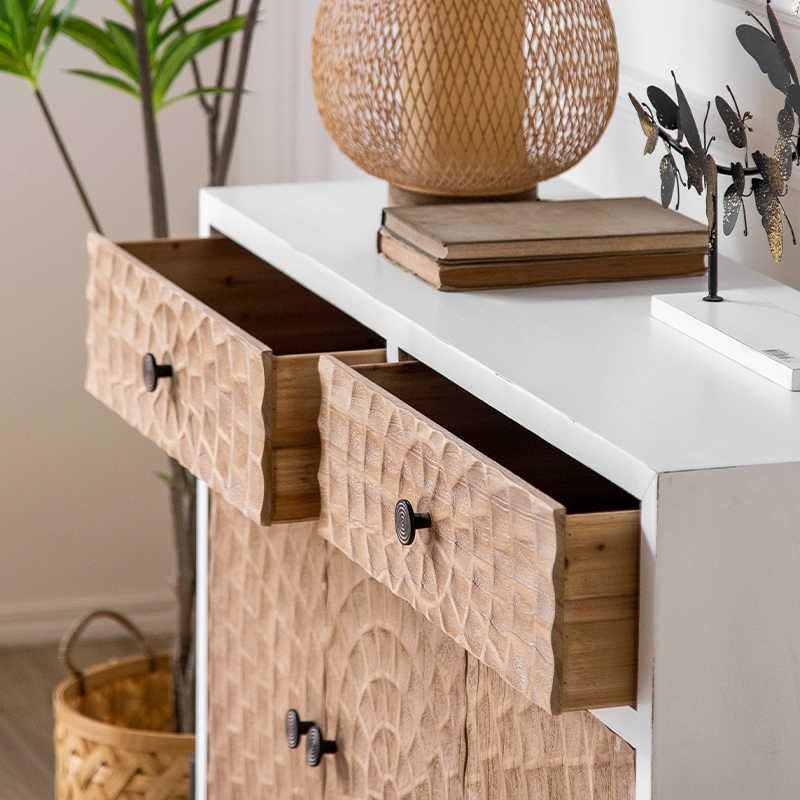 Product description: Discover the perfect fusion of artisanal craftsmanship and contemporary design with this striking Wabi-Sabi Vintage Distressed Sideboard. At 49.6x15x35.4 inches, this distinctive piece showcases five meticulously hand-carved wood panels featuring mesmerizing geometric patterns, sunbursts, and diamond motifs that create captivating visual depth. The sophisticated design marries weathered wood textures with a pristine white frame, supported by elegant black steel legs that add industrial sophistication. Two spacious drawers and a three-door cabinet section provide versatile storage options, making it ideal for multiple settings - from a statement entryway piece to a bedroom storage solution. Each sideboard is uniquely crafted, with the natural variations in wood grain and hand-carved details ensuring no two pieces are identical. The thoughtful contrast between rustic carved elements and modern structural details celebrates the beauty of imperfection, while the combination of solid wood construction and steel accents promises enduring style. Perfect as a distinctive focal point in both residential spaces and boutique hospitality settings.