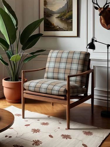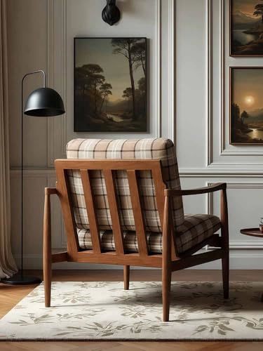 Vintage Solid Wood Armchair Designer Plaid Single Lounge Chair for Living Room