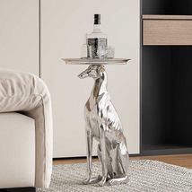 Product description: Elevate your living space with this striking Metallic Greyhound Side Table Sculpture, where artistry meets functionality in perfect harmony. Standing 21.3 inches tall with a depth of 15.7 inches, this sophisticated piece captures the graceful silhouette of a greyhound in gleaming chrome finish. The mirror-like surface creates captivating light play throughout your space, while the integrated circular tray offers practical utility for displaying decorative objects or serving refreshments. The sculpture's sleek lines and polished construction make it an ideal statement piece for contemporary interiors, whether positioned in entryways, beside sofas, or as an artistic accent in modern bedrooms and offices. This versatile piece seamlessly combines sculptural elegance with practical function, transforming any room into a curated gallery-like space while providing a convenient surface for daily use.