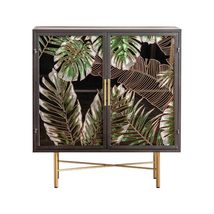 Product description: Transform your living space with this exquisite hand-painted glass door console cabinet. The stunning tropical monstera leaf artwork, rendered in vibrant emerald green with copper metallic accents, creates an artistic focal point while providing practical storage. Measuring 37x83.5x90.5cm, this sophisticated piece combines a rich dark wood frame with elegant brass-finished legs for timeless appeal. The spacious interior behind glass doors offers perfect display and storage for your cherished items, from dinnerware to decorative collections. Ideal for entryways, living rooms, or dining areas, this versatile cabinet maximizes storage while maintaining a refined aesthetic suitable for modern homes and apartments. Each piece showcases unique variations in the hand-painted details, making it a truly distinctive addition to your decor. The thoughtful combination of wood, glass, and brass elements creates a luxurious statement piece that seamlessly blends functionality with artistic expression.