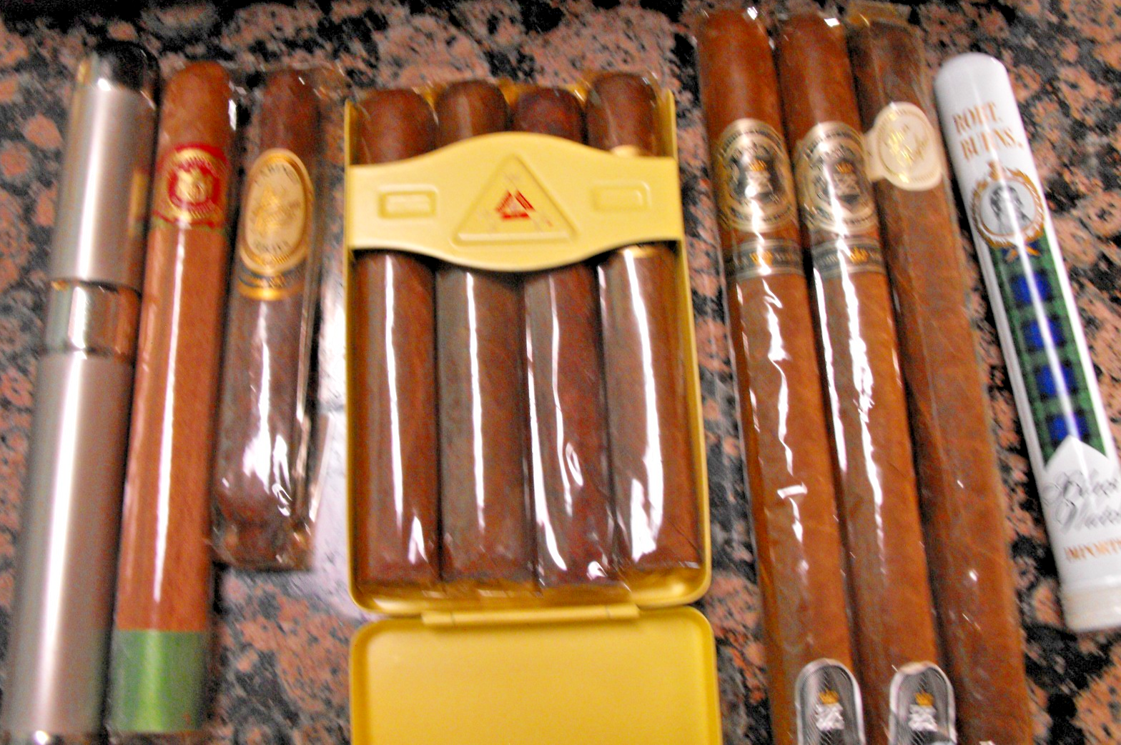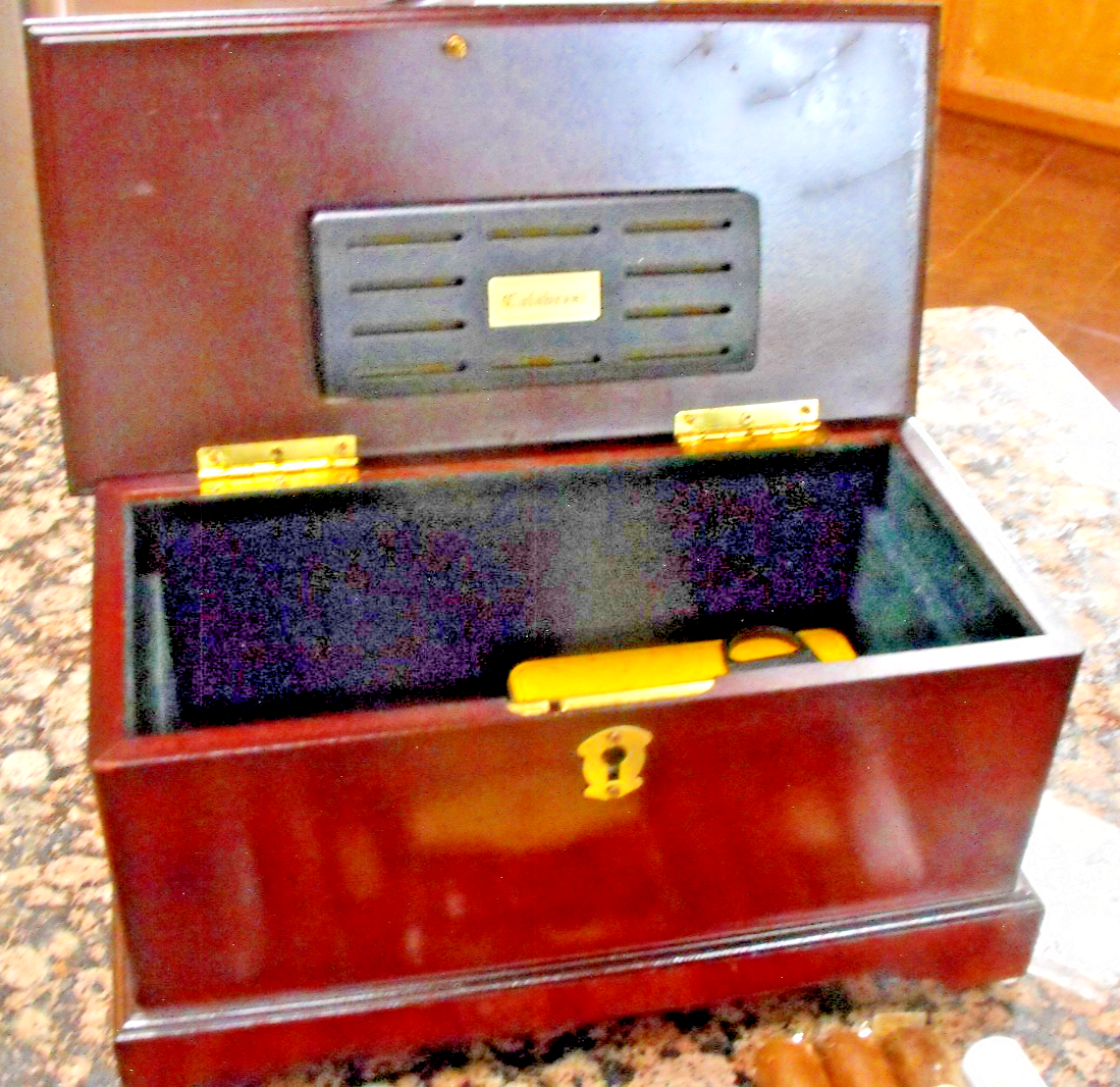 Vintage Cigar Storage Humidor, Cherry, Velour Lined w Assorted Cigars & Cutter