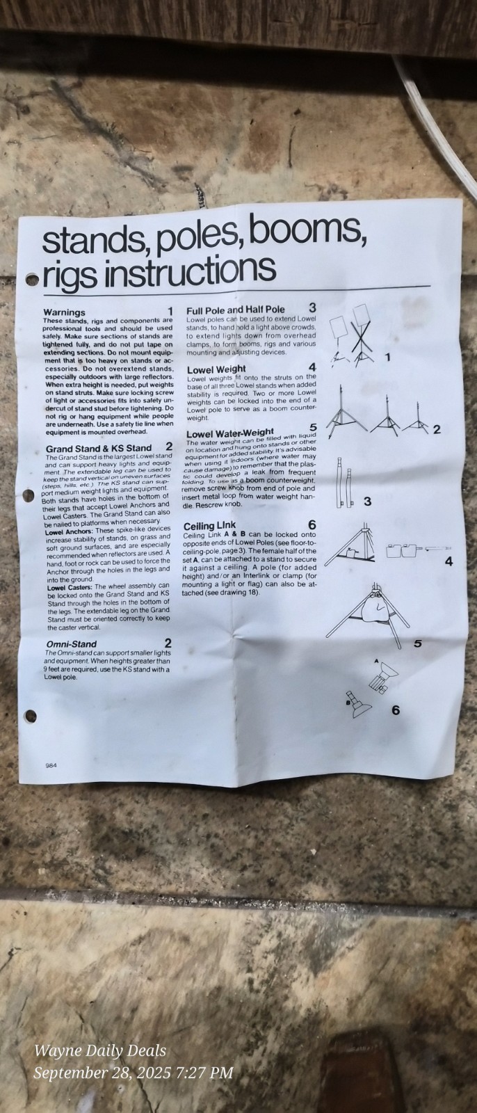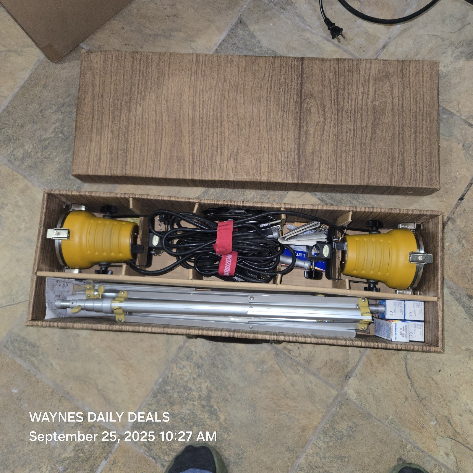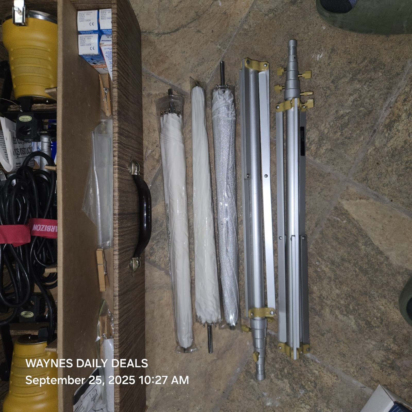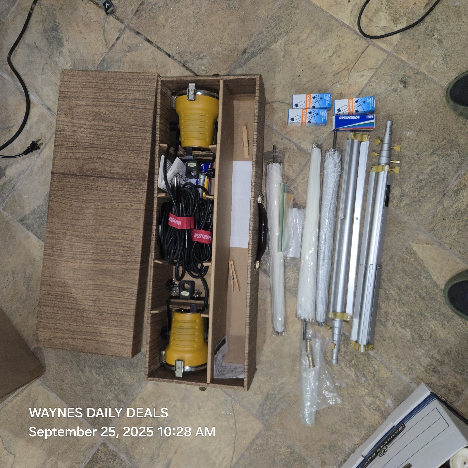 Lights power on; one screw shows thread and there?s brown staining on the back of both lights (cosmetic only). Umbrellas and stands in good shape, spare bulbs included.