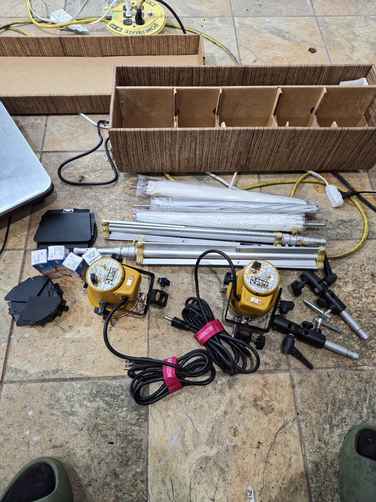 Estate sale find ? Vintage Acme-Lite Q-Brite Model 660 studio lighting kit. Classic 600W quartz lights with stands and umbrellas.