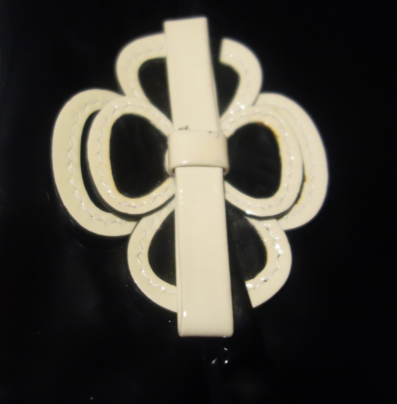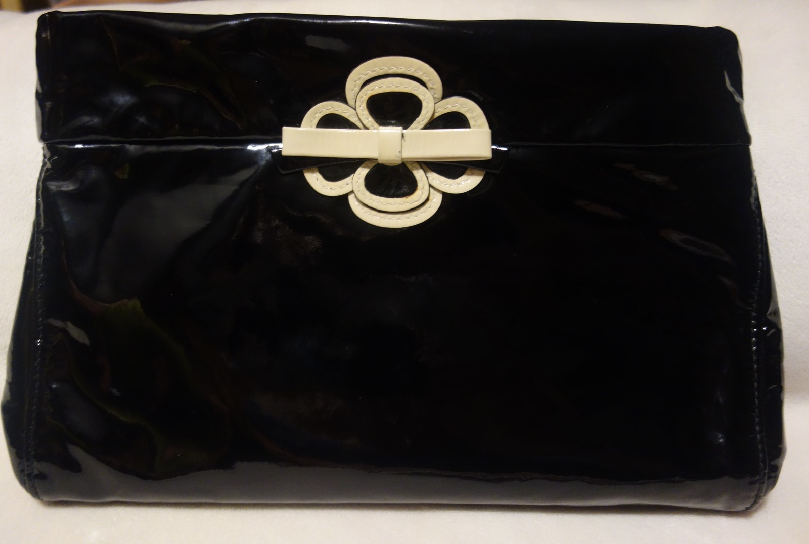 Black patent lambskin leather clutch with a white bow and flower embellishment