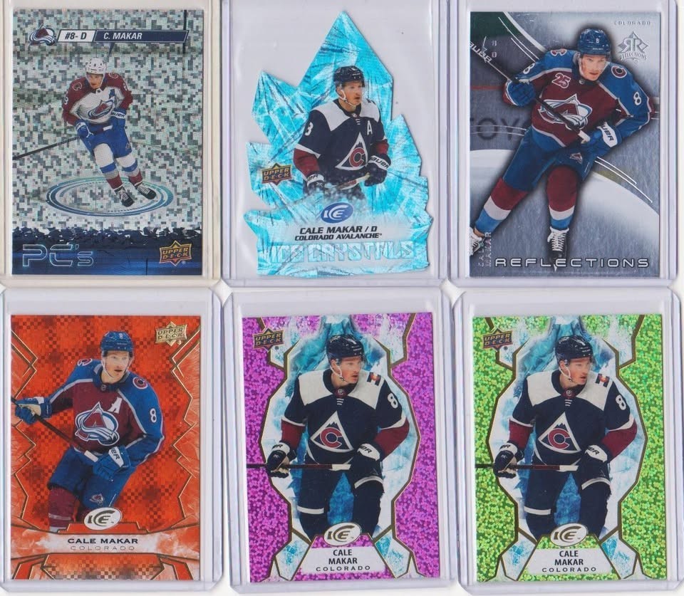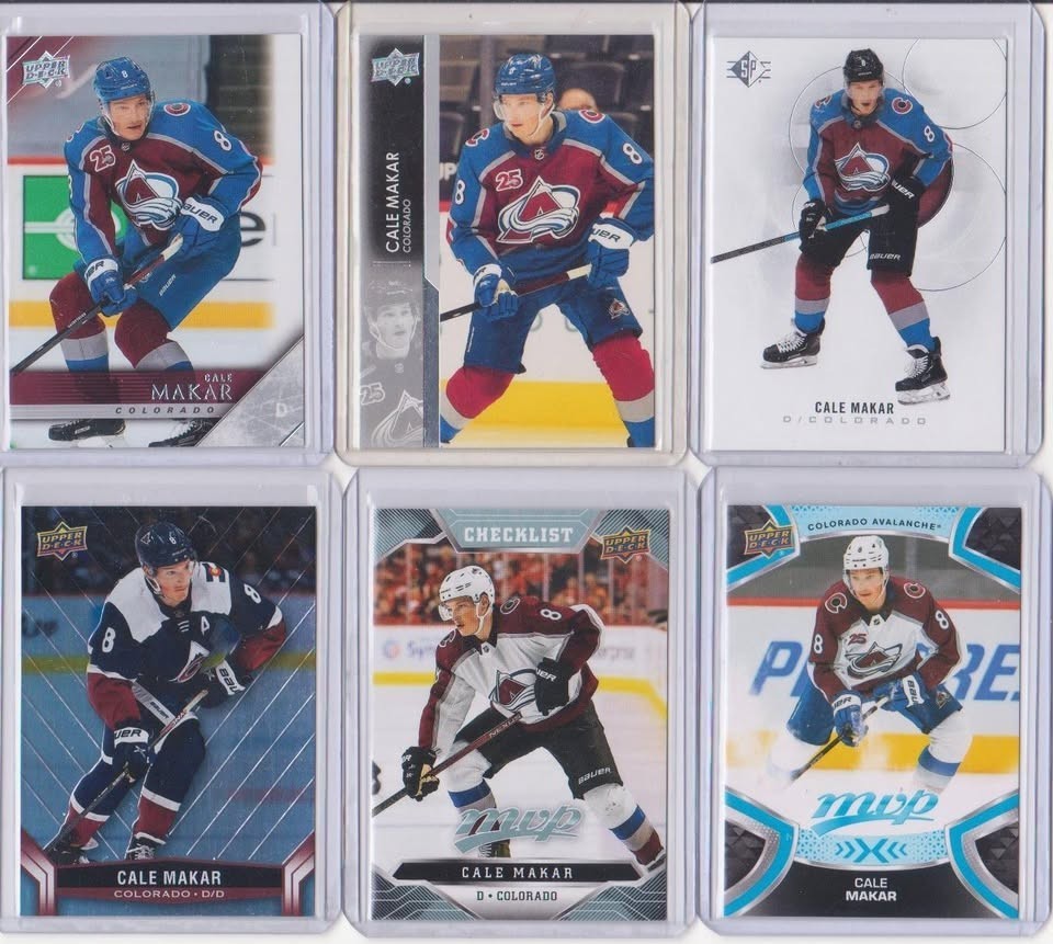 The product is a lot of 45 Cale Makar mixed serial numbered sports trading cards. The cards feature the player Cale Makar from the Colorado Avalanche in the National Hockey League (NHL). Manufactured by Upper Deck, these cards would be a valuable addition to any ice hockey trading card collection. Each card would be unique, making it a desirable item for fans and collectors of sports memorabilia.