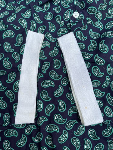 There are some small marks on white cuff of sleeve in back. Haven?t tried to remove. Otherwise, shirt looks unworn.