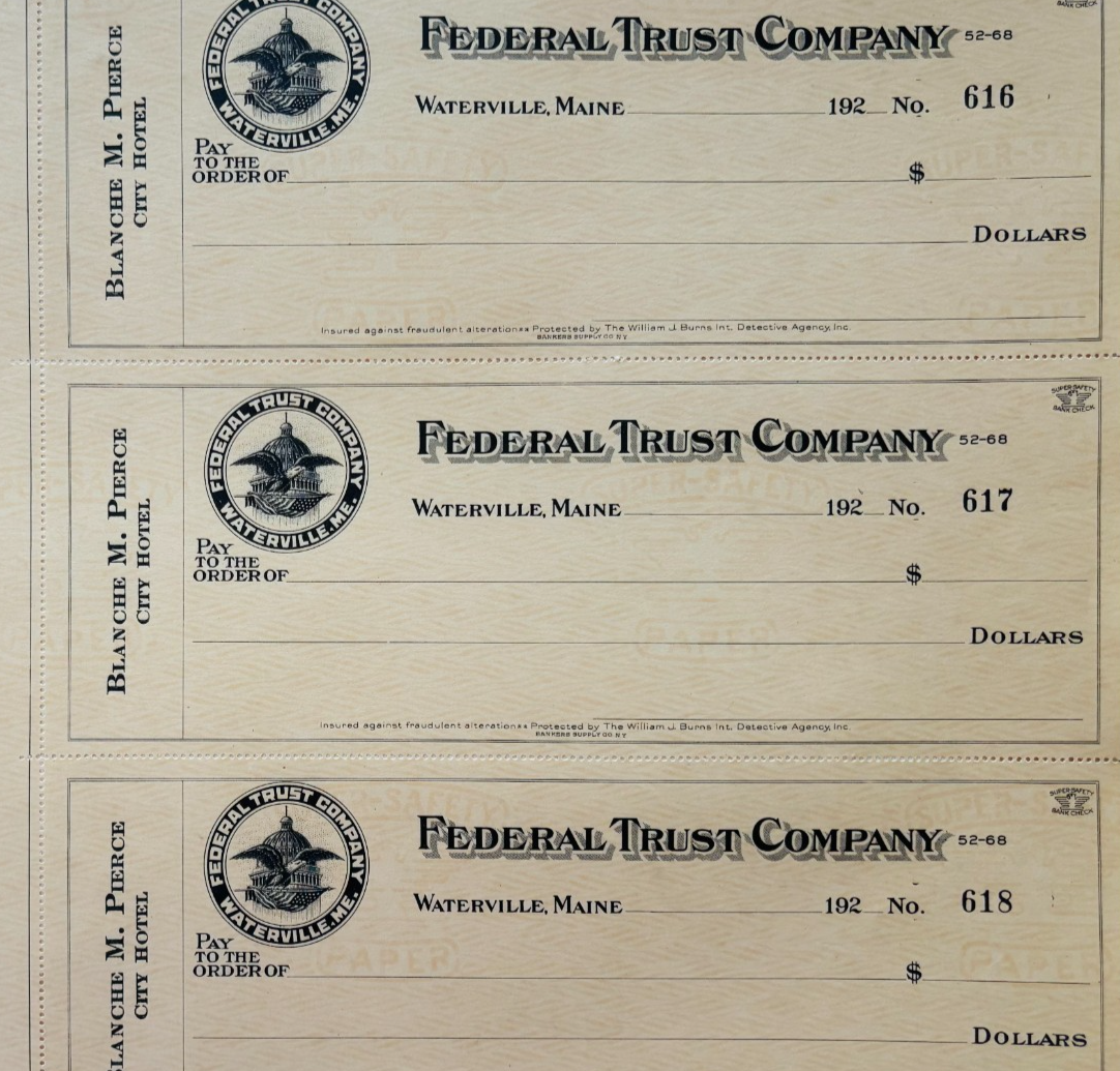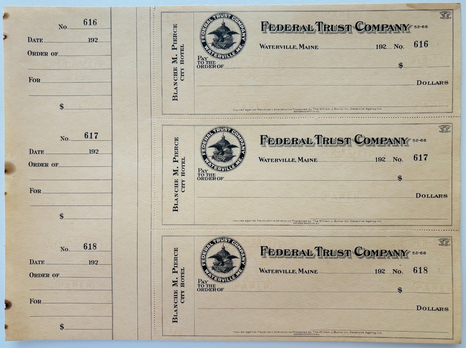 1920 Federal Trust Checks Lot of 3 City Hotel Waterville Maine 616-618 F18C1