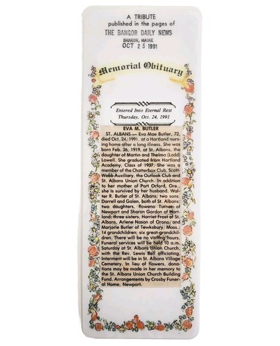 Memorial Tribute Laminated Bookmark Bangor News Eva Butler Ephemera Vintage E83E