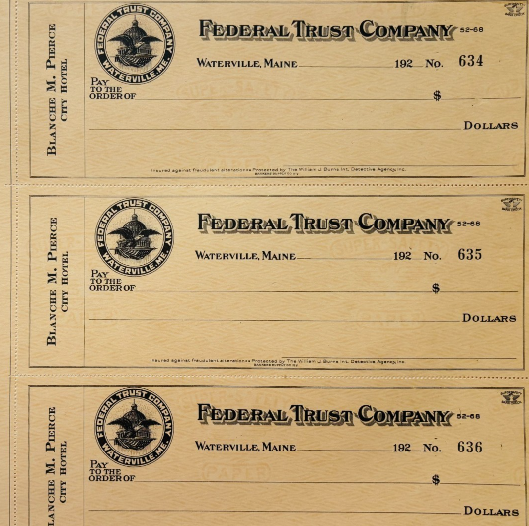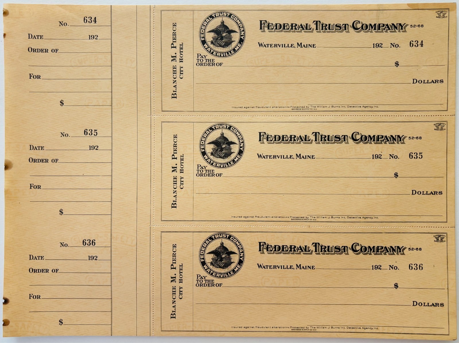 1920 Federal Trust Checks Lot of 3 City Hotel Waterville Maine 634-636 F18C1