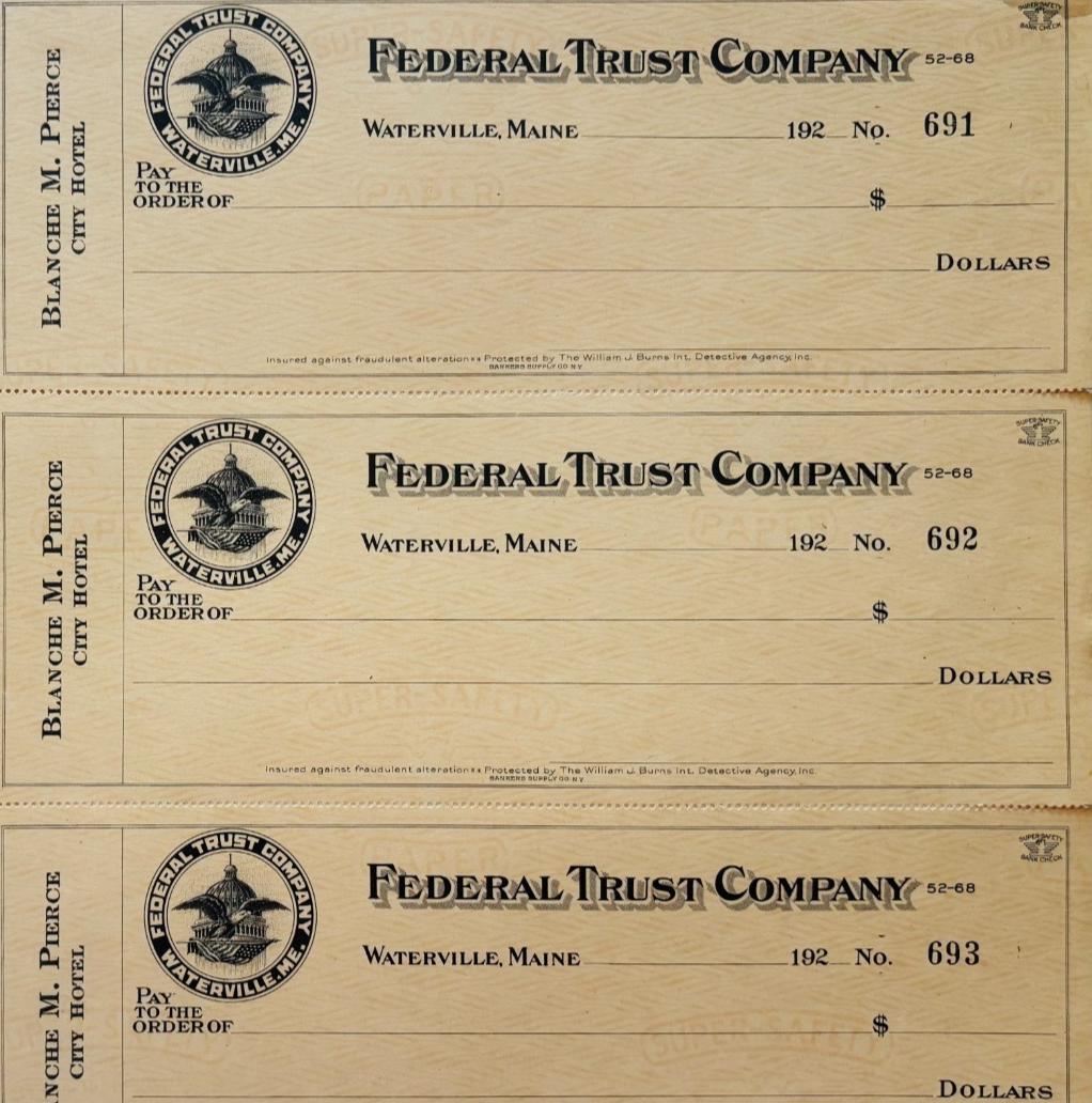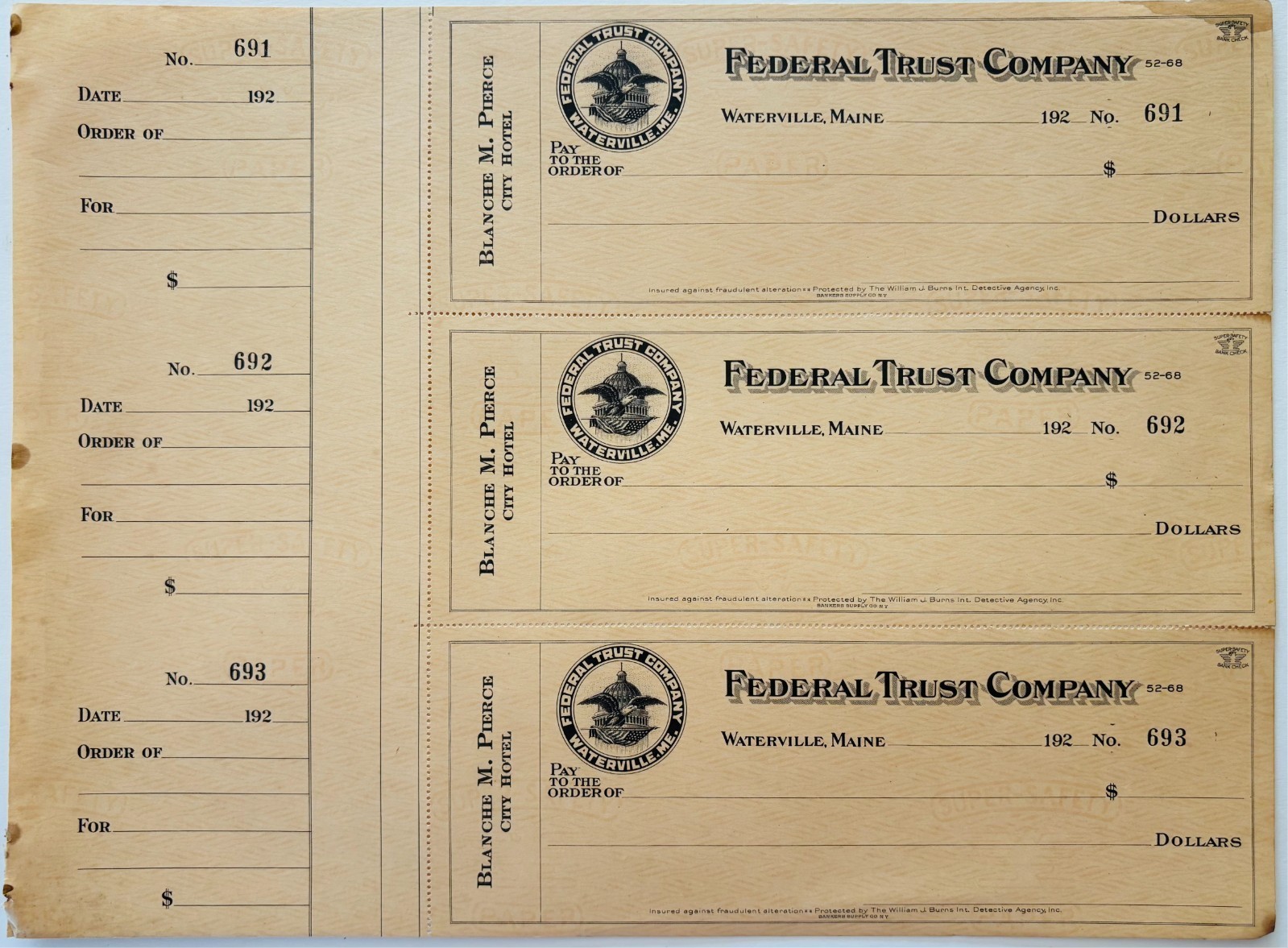 1920 Federal Trust Checks Lot of 3 City Hotel Waterville Maine 691-693 F18C1