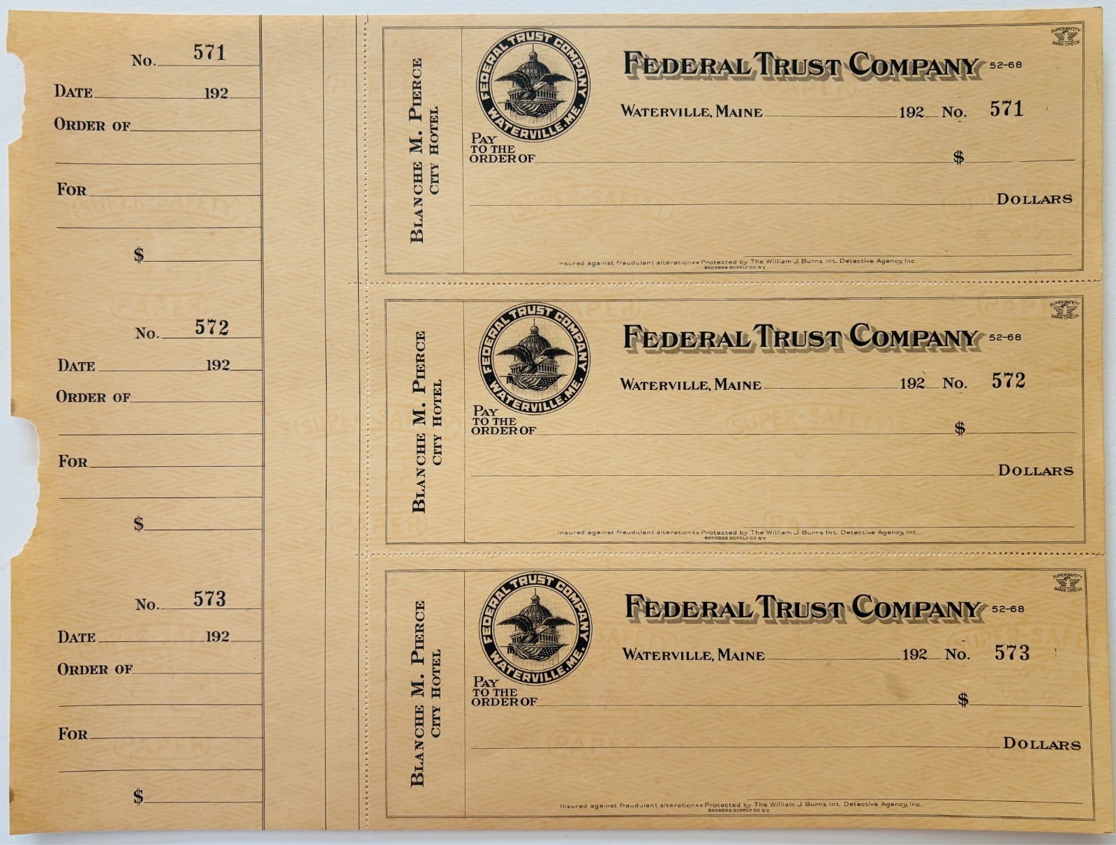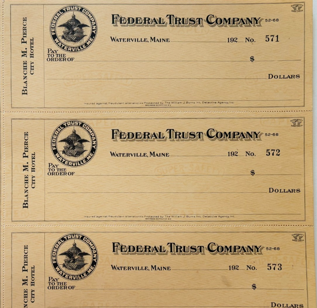 1920 Federal Trust Checks Lot of 3 City Hotel Waterville Maine 671-673 F18C2