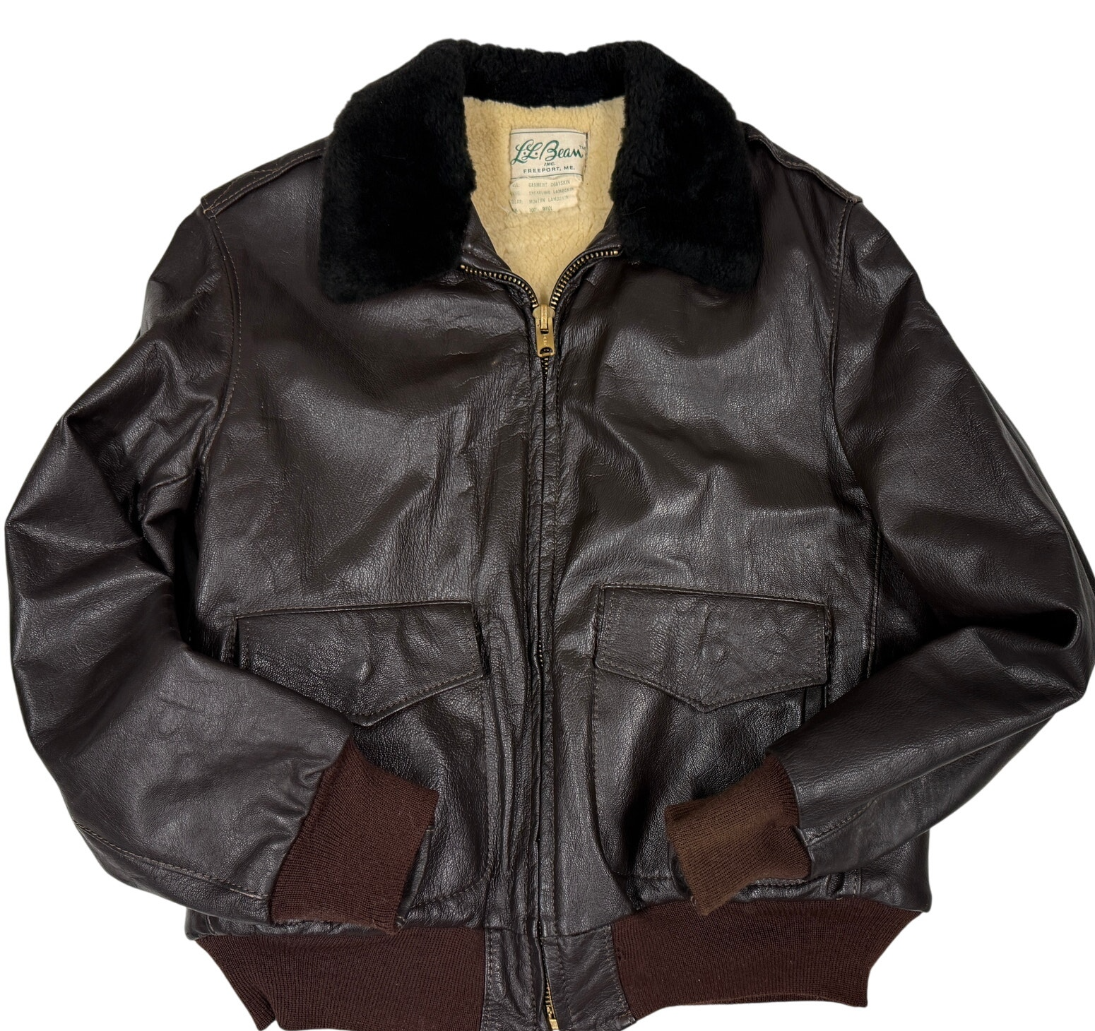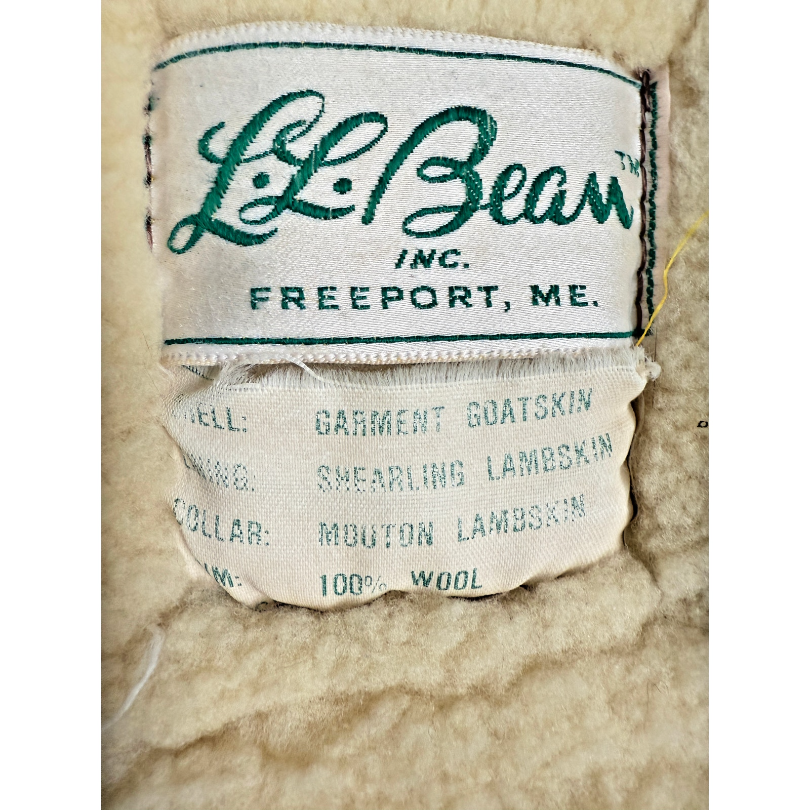 Authentic vintage LL Bean goatskin leather bomber/aviator jacket with mouton lamb collar and shearling lining. Crafted in heavyweight brown goatskin leather, fully lined with cream/ivory shearling that?s clean and flawless. Features a working brass Talon zipper, hip pockets, inner breast pocket, and quilted nylon sleeve lining for ease of movement. In exceptional vintage condition ? supple, broken-in leather, no odors, stains, or flaws. A true rugged classic.