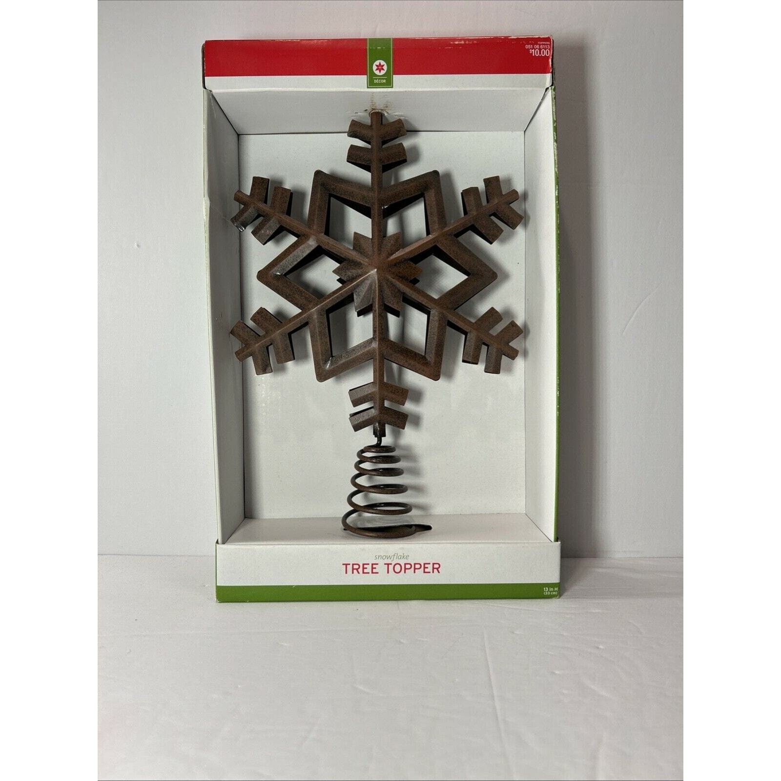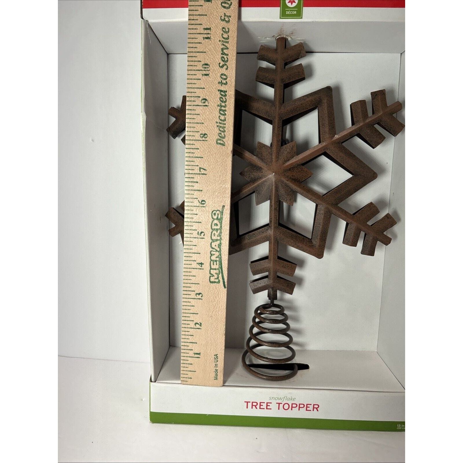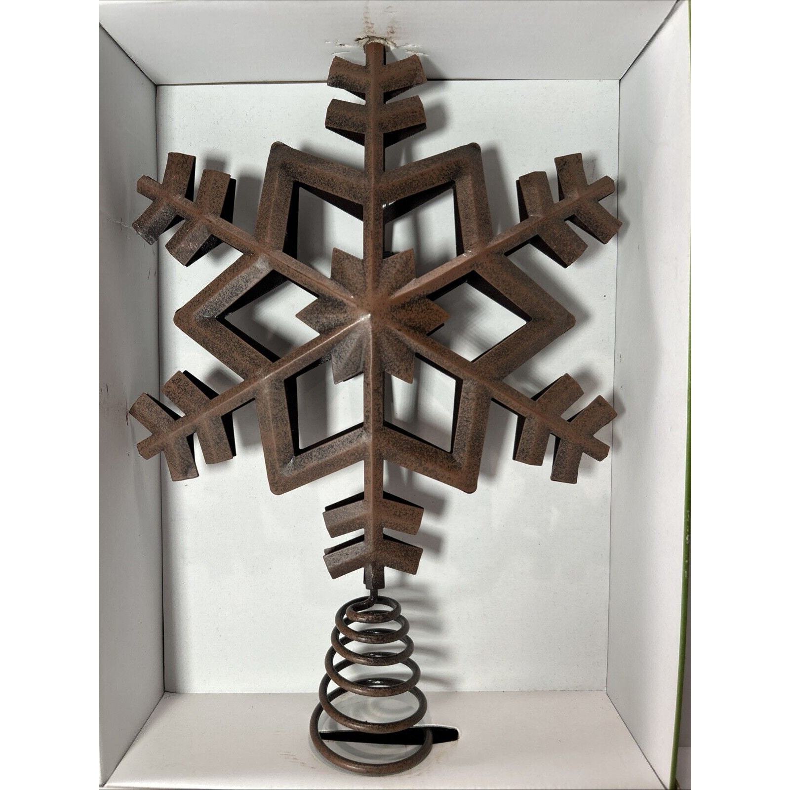 Bring festive charm to your Christmas tree with this metal snowflake tree topper. Crafted in a rustic brown finish with an intricate cut-out snowflake design, it adds a timeless winter touch to your holiday decor. The sturdy spring base makes it easy to secure to the top of most trees.