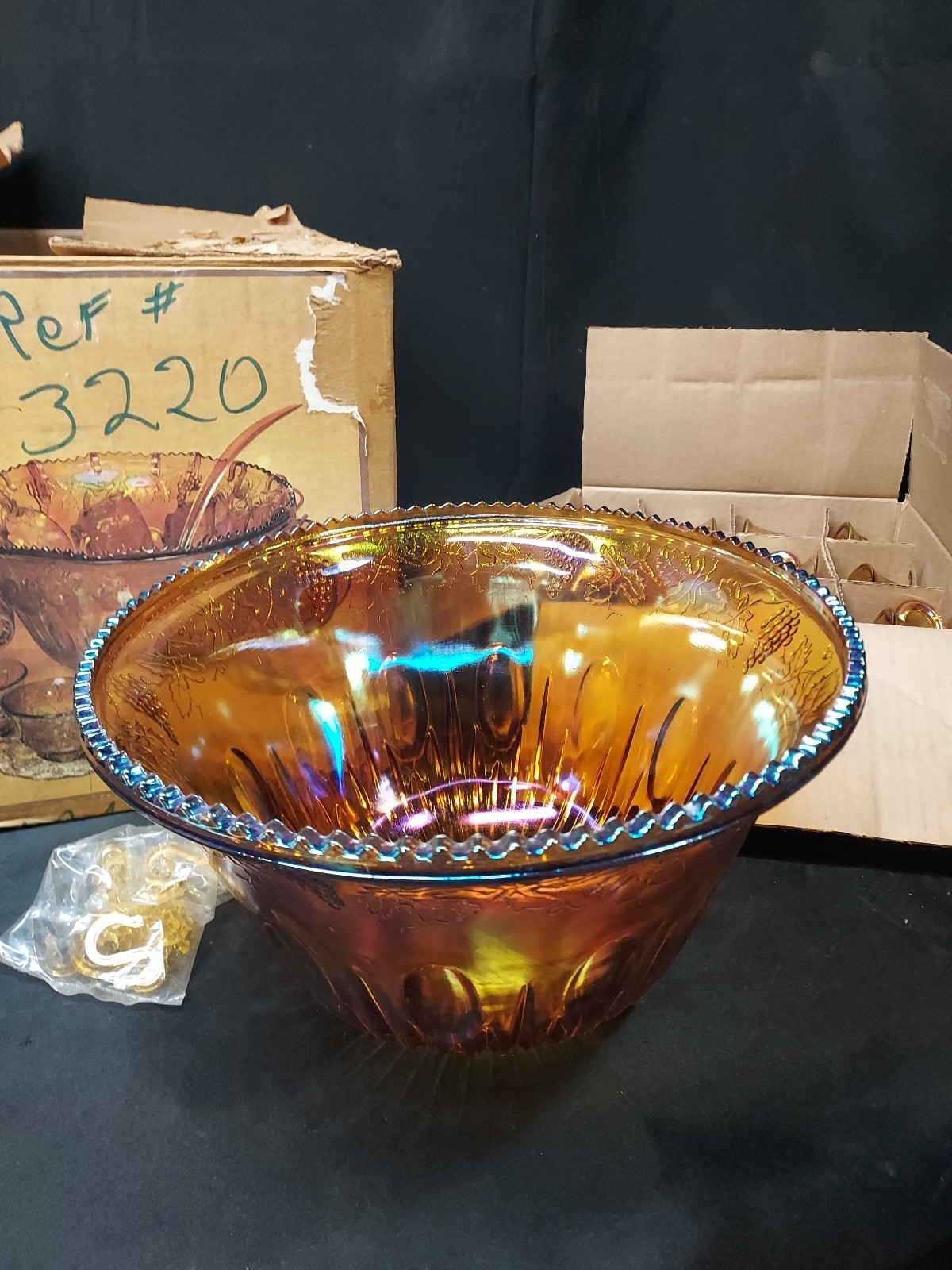 MID CENTURY Marigold Carnival Indiana Glass Punch Bowl Set Original Box Unused