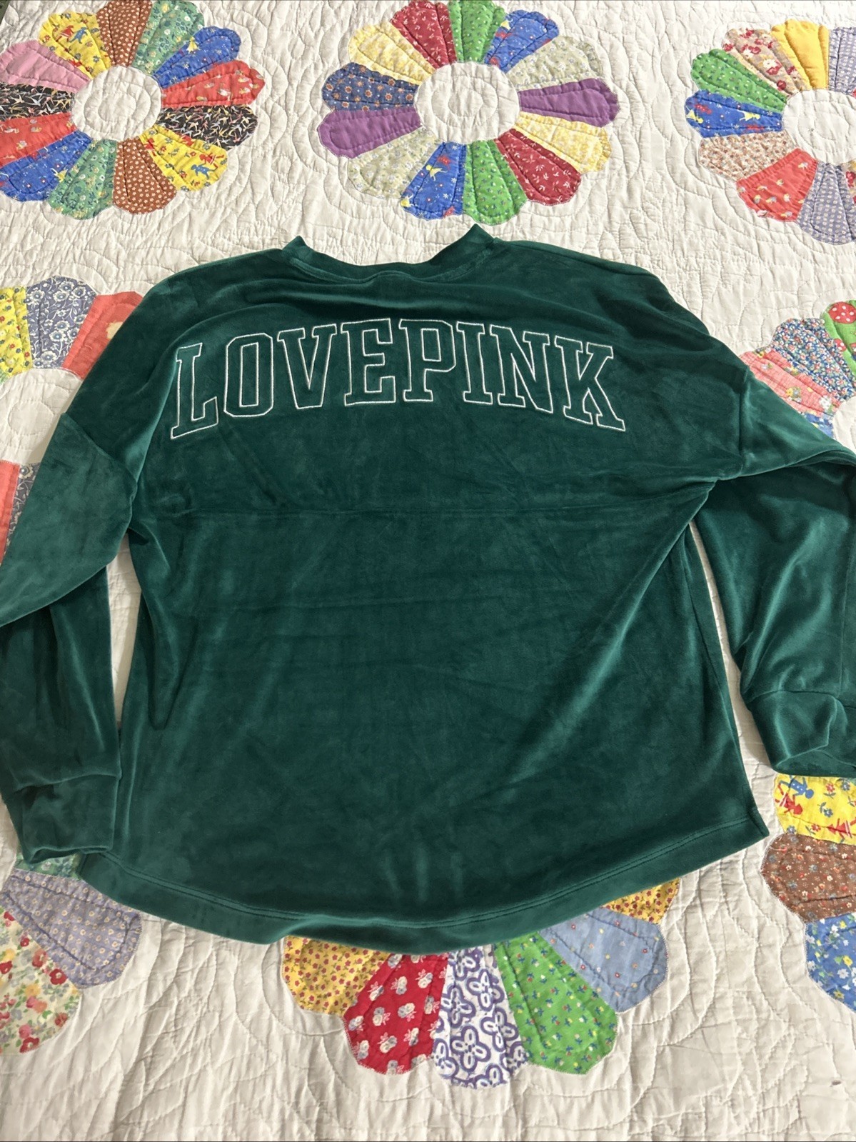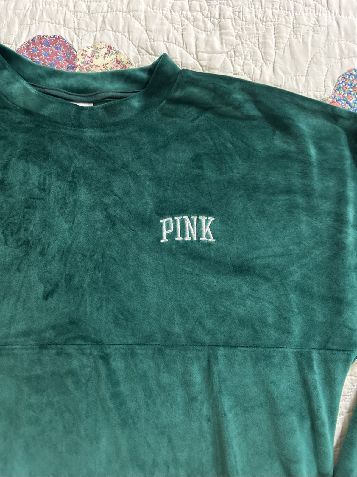 Victorias Secret PINK Varsity green Velour Sweatshirt Crew Neck Spirit Jersey. Oversized fit