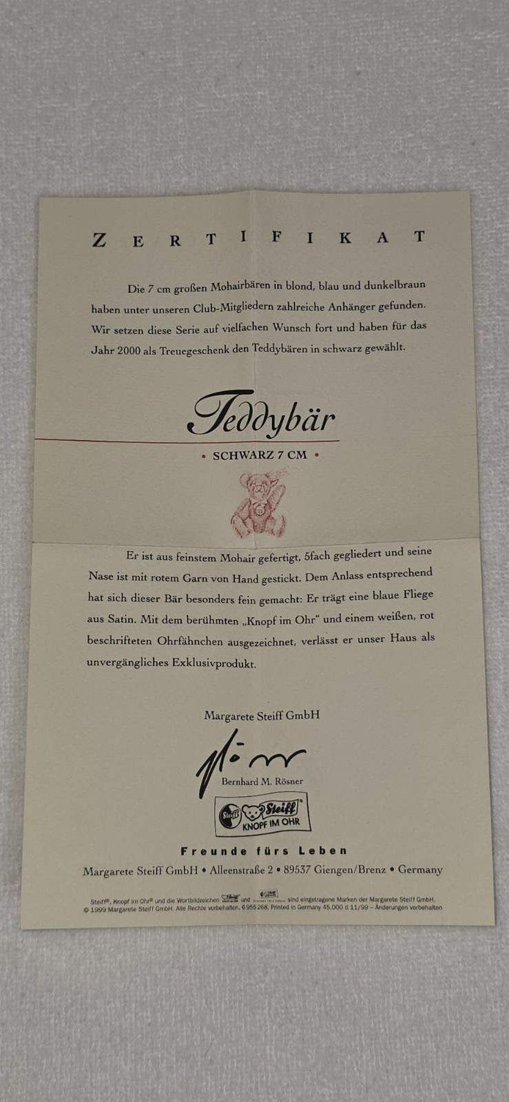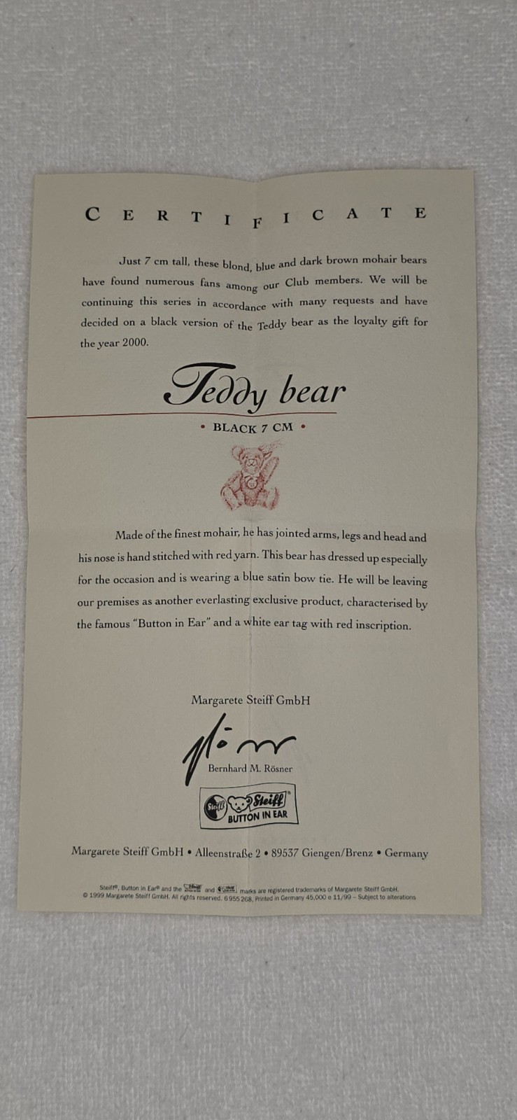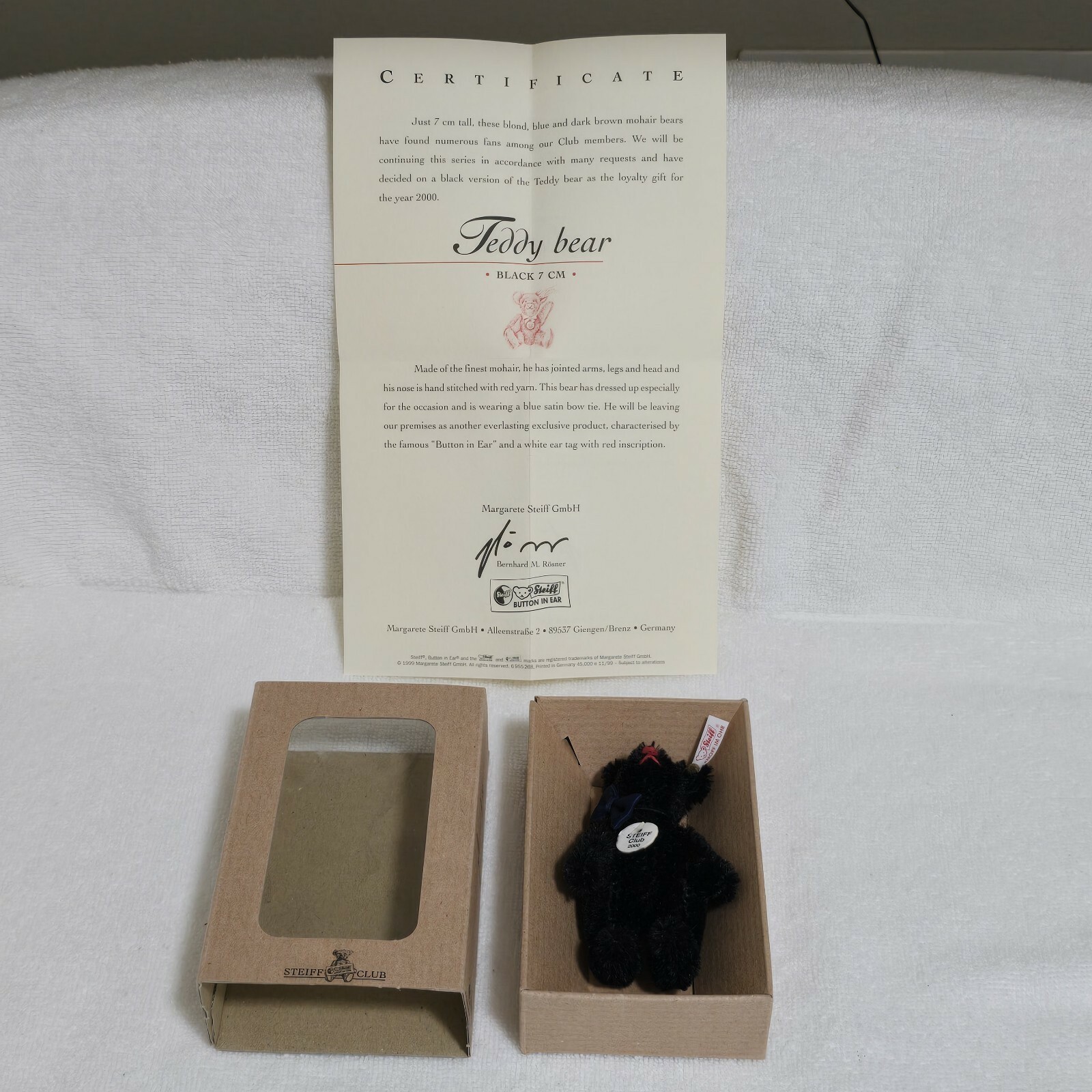 2000 Steiff Mohair Club Mini Jointed Black Teddy Bear Button In Ear Certificate