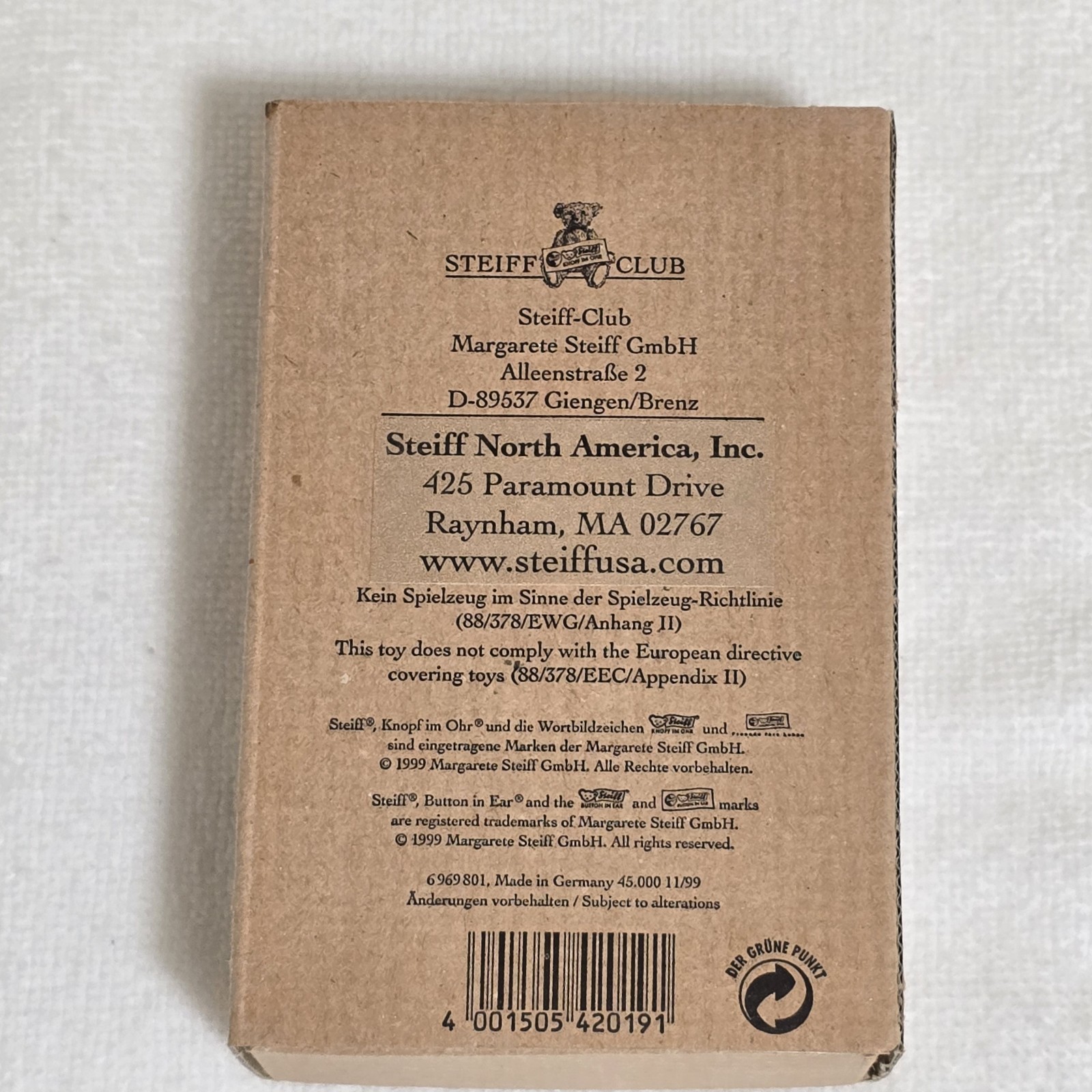 Includes the original Button in Ear / Paper Ear tag, Round Date Tag on the chest, Original Certificate and Box.
