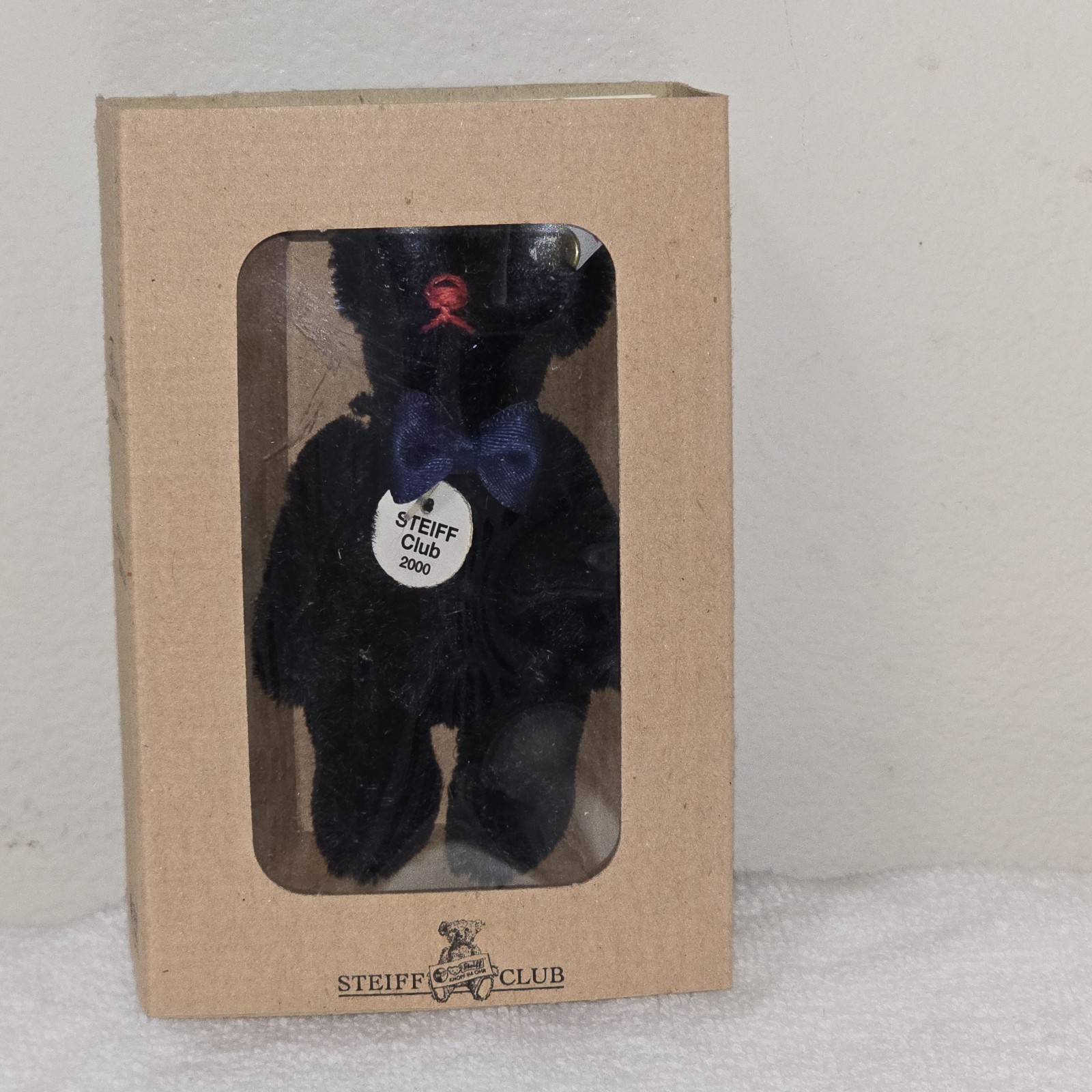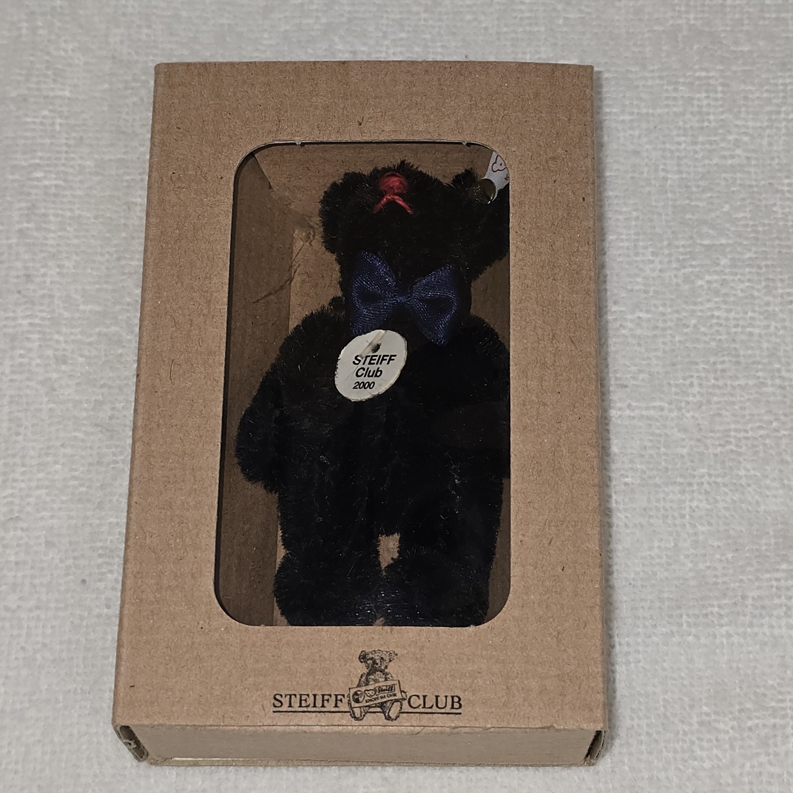 New in Open Box Vintage 2000 Steiff Mohair Club Mini Jointed Black Teddy Bear with a Blue Satin Bow Tie. Measures approximately: 4" length standing - 7 cm / 2.76" sitting down.
