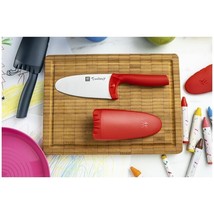 The chef?s knife comes in RED and features a sharp stainless-steel blade with a rounded tip to keep kids safe from accidents. Other safety and comfort features include a full protective bolster and a blade sheath for safe storage that doubles as a finger protector while cutting. The clever finger protector features a narrow shape that helps children hold the item to be cut in place, all while guiding the knife flexibly along its edge and protecting your child's fingers. As with all knives, adult supervision is recommended.