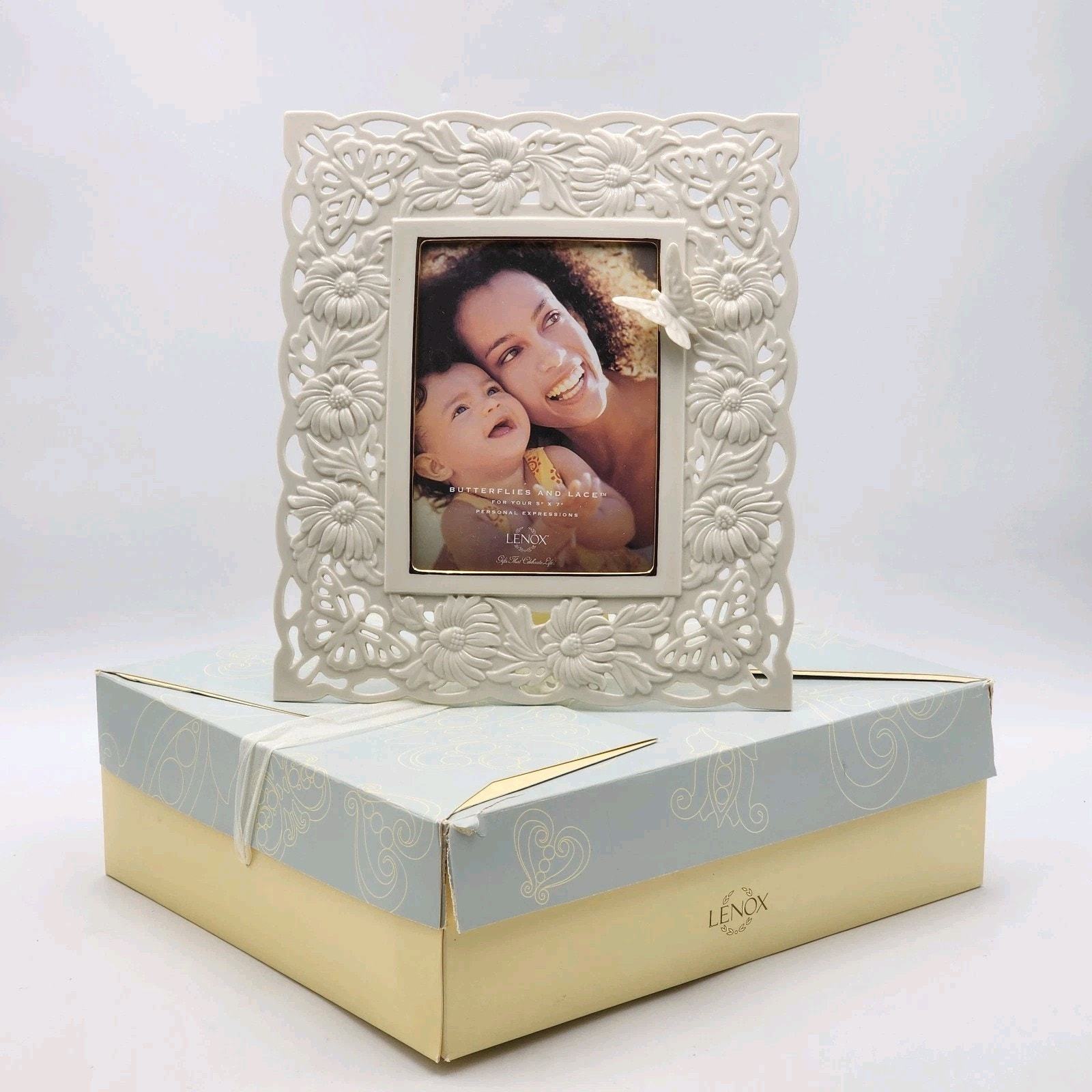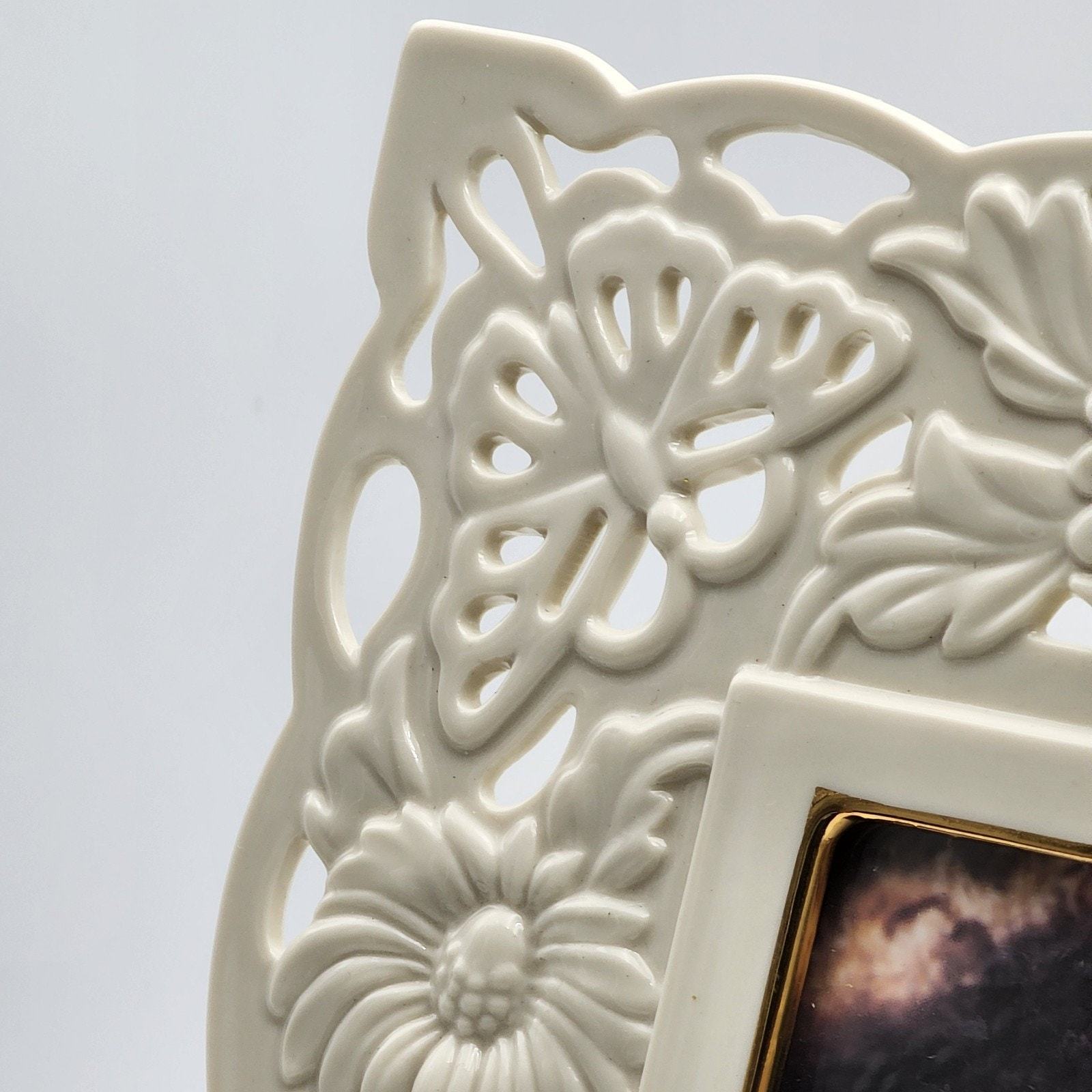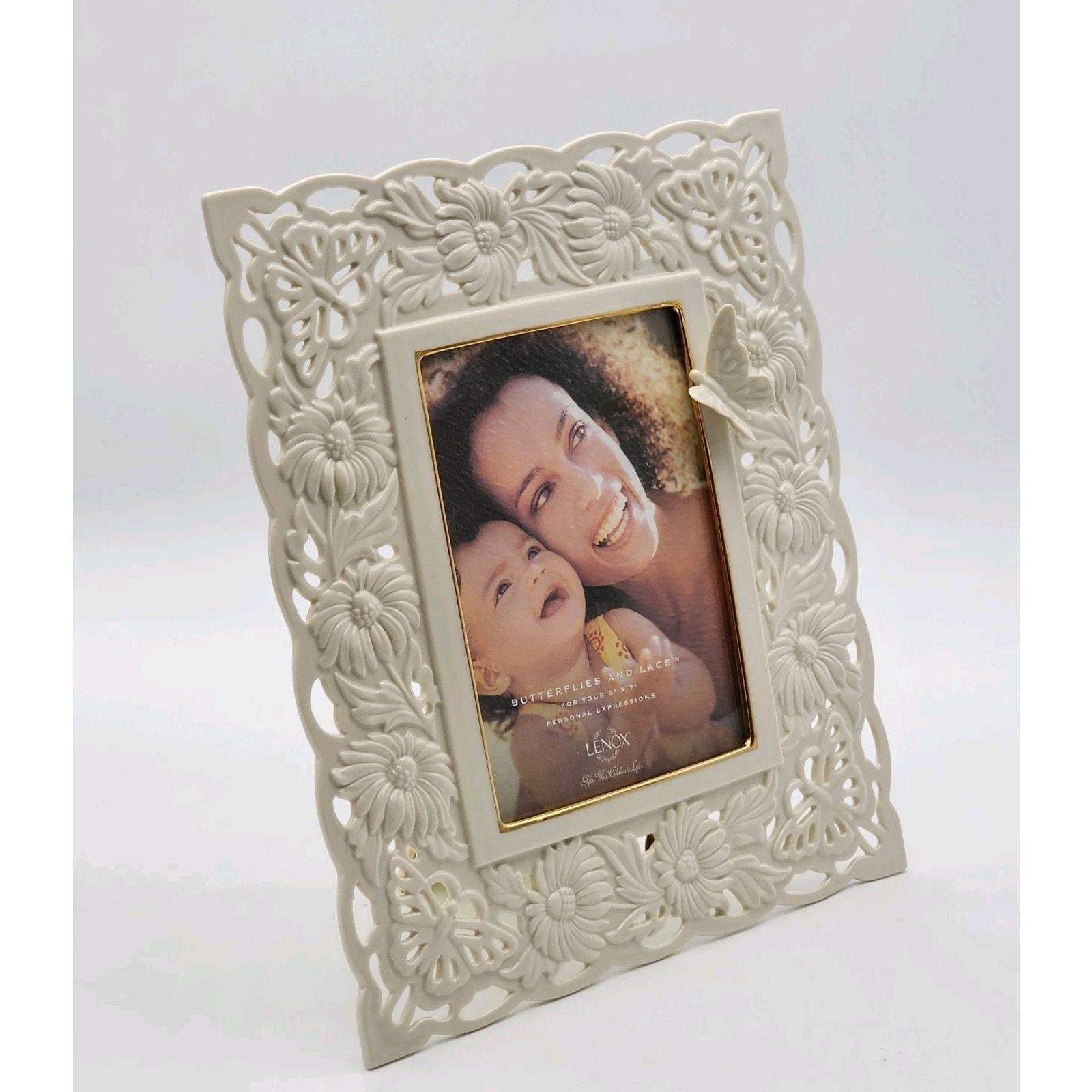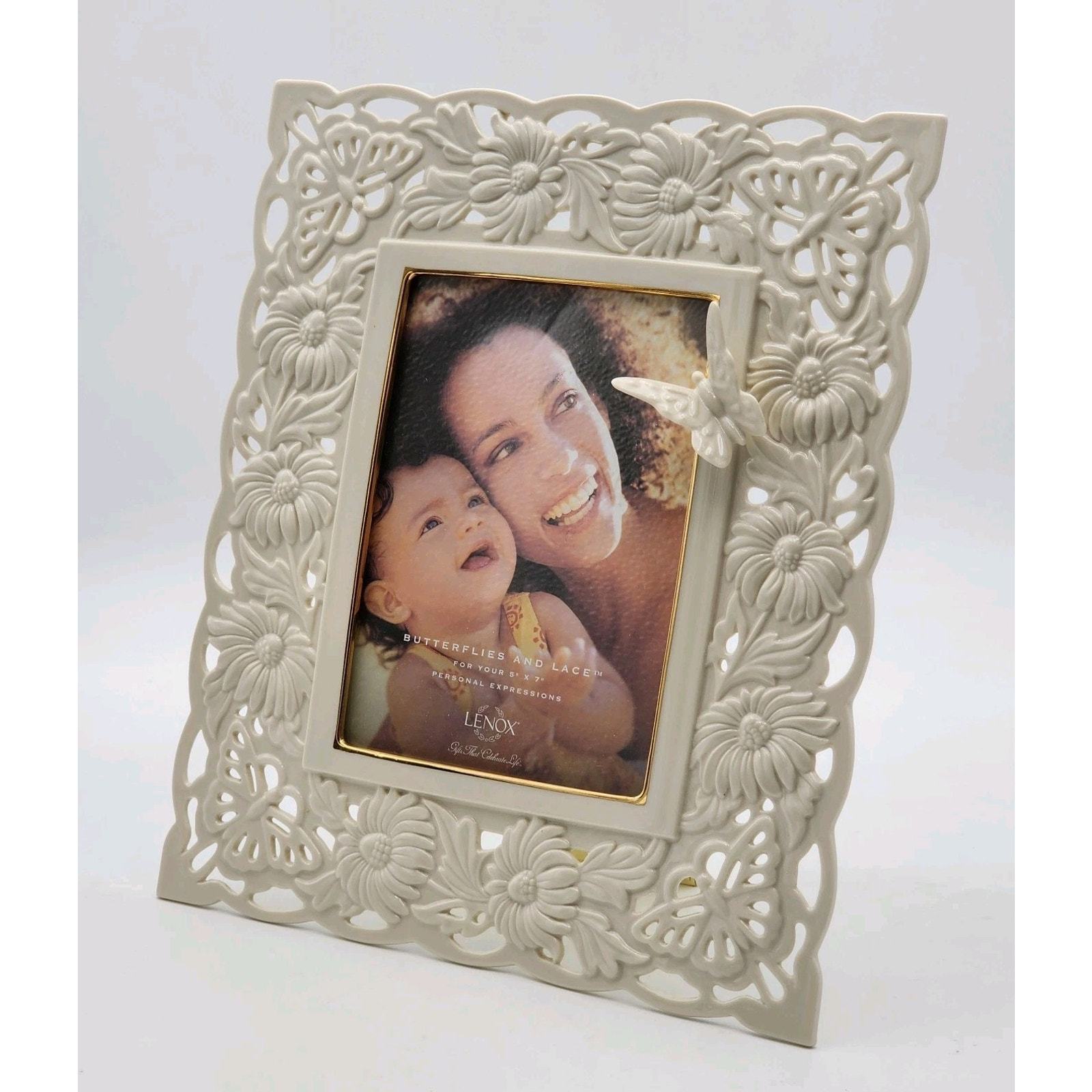 Showcase your cherished memories with this elegant porcelain picture frame from the Lenox Butterflies and Lace collection. Crafted in ivory porcelain with intricate floral and butterfly cutout details, this frame features a raised butterfly accent and a gold-tone trim around the photo opening. A timeless Lenox design perfect for displaying treasured photos.