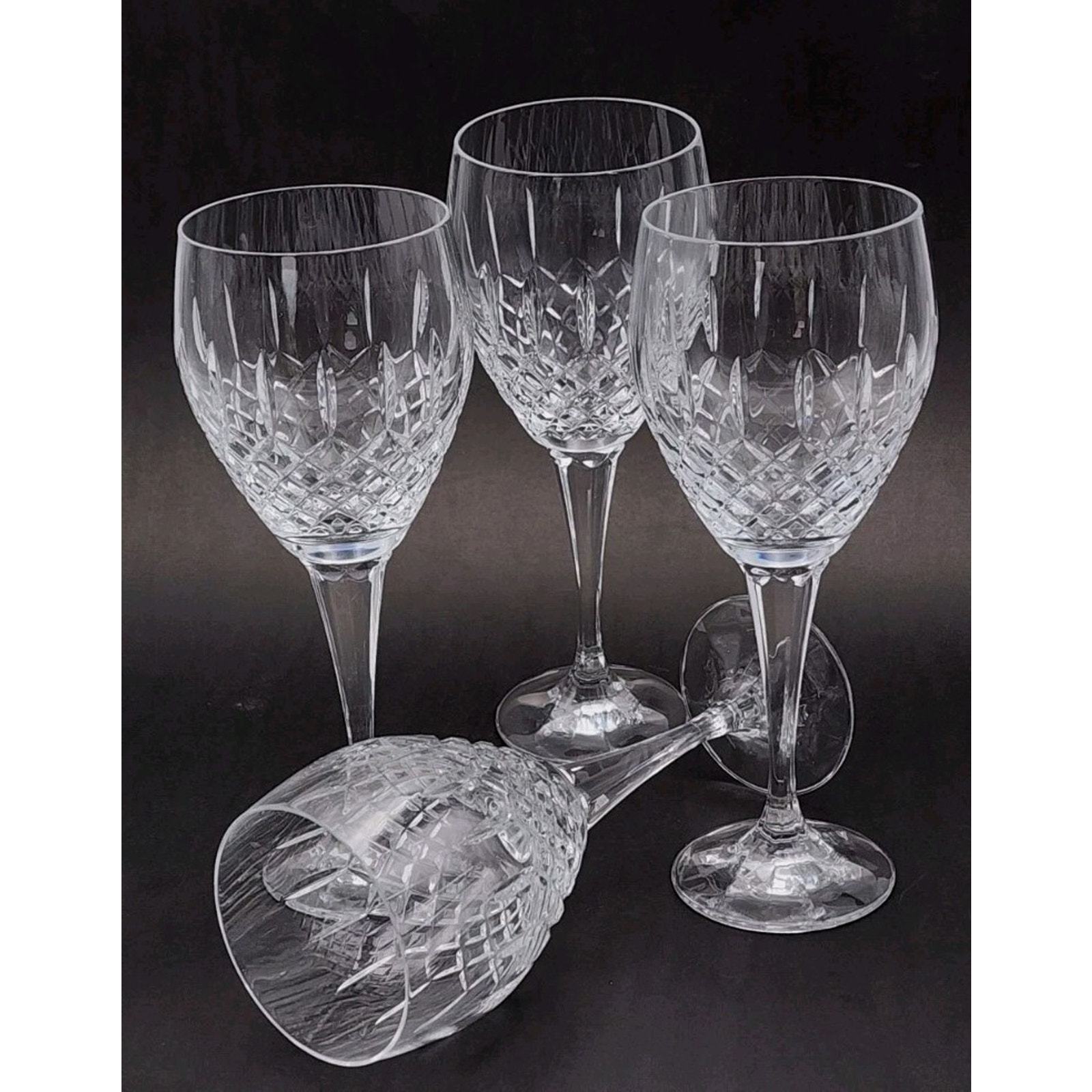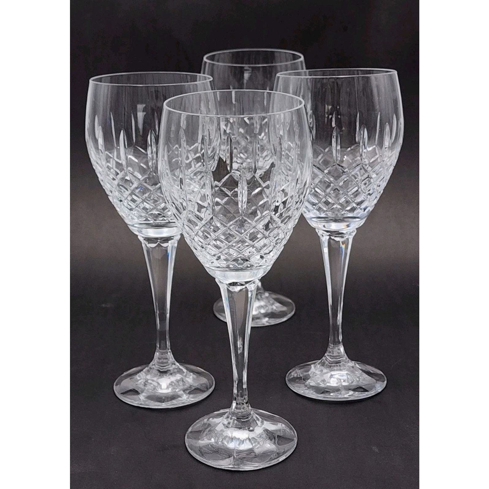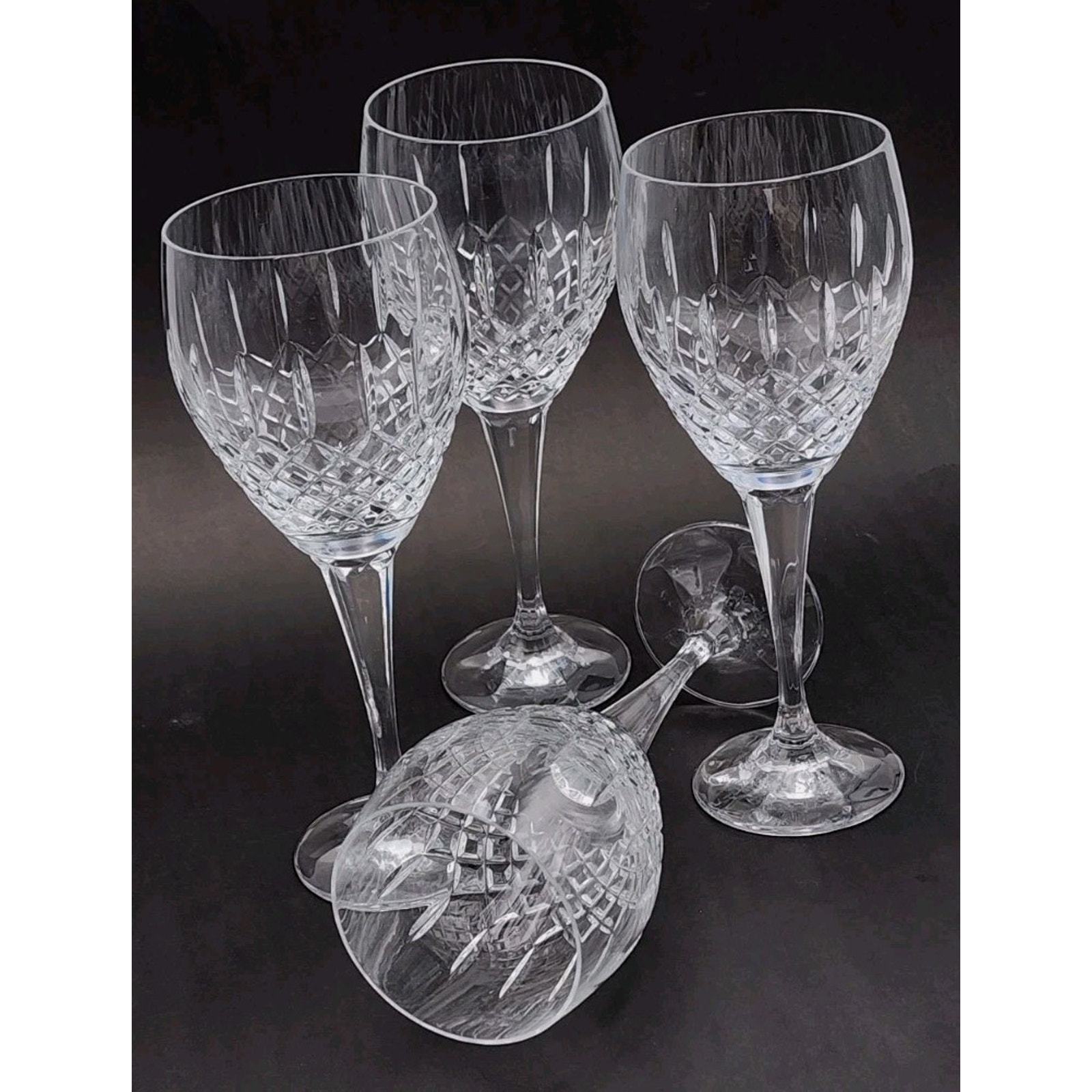 This 4 piece set of Mikasa Coventry crystal Tulip bowl shaped wine glasses / water goblets feature a distinctive criss-cross vertical cut pattern above a band of diamond cuts, with a plain, polished base. This design creates a sparkling, light-reflective quality, giving the glassware a glimmering and luxurious appearance. The crystal is clear and transparent, showcasing its delicate and brittle nature, with a refined ornate aesthetic suitable for formal dining occasions, celebrations, or toasts. The craftsmanship is evident in the precise cuts and polished finish, making each piece appear shiny and sophisticated, ideal as heirloom-quality tableware or decorative serveware.