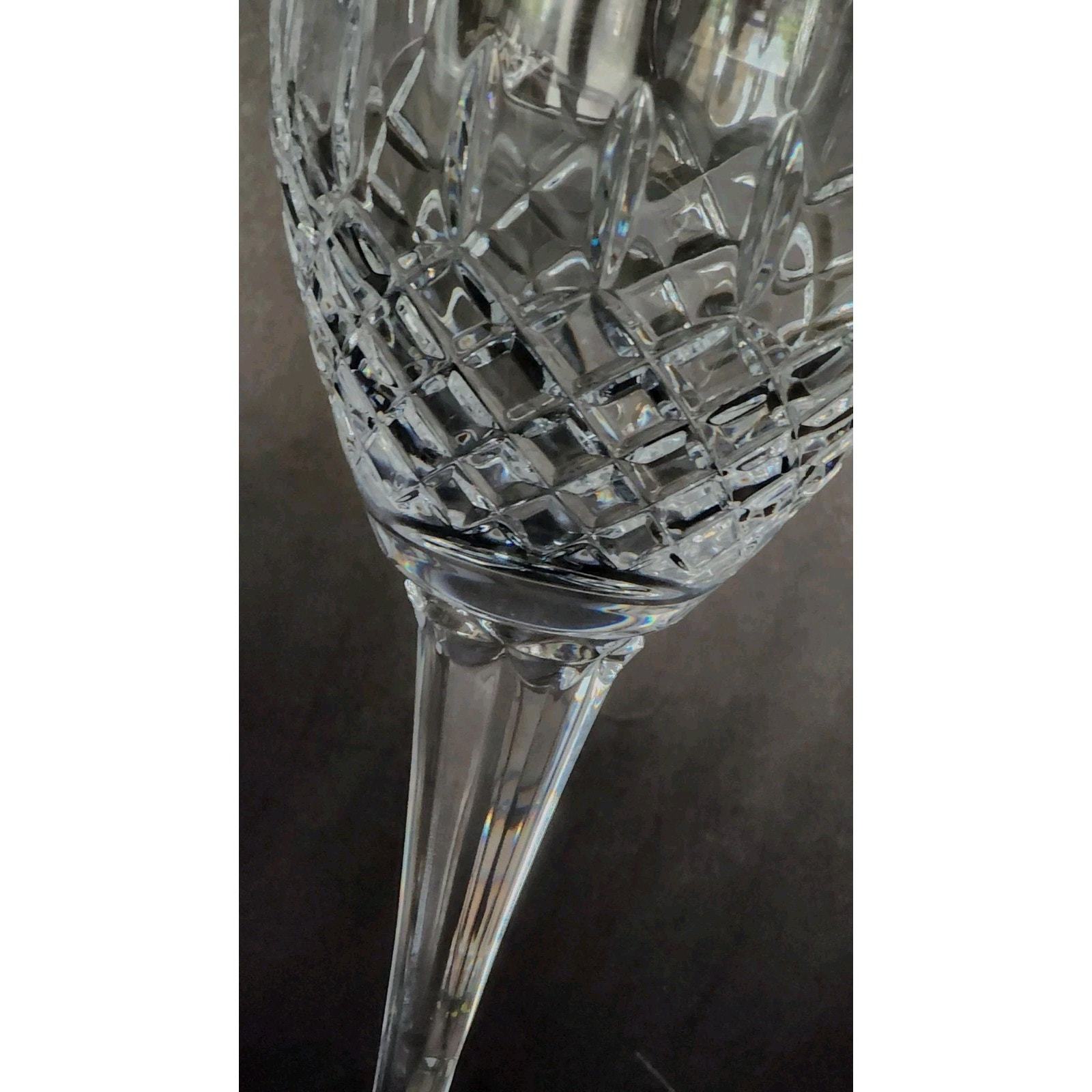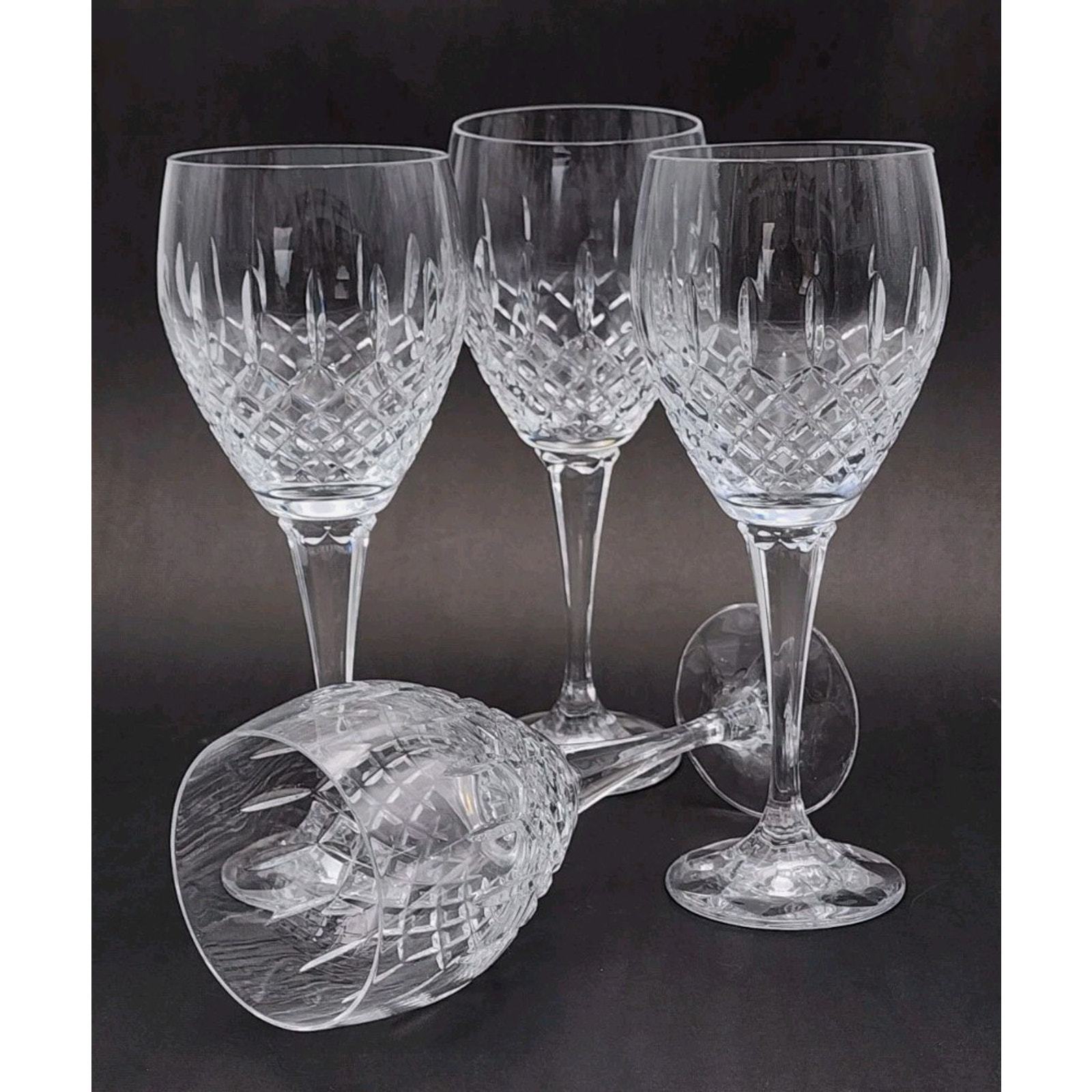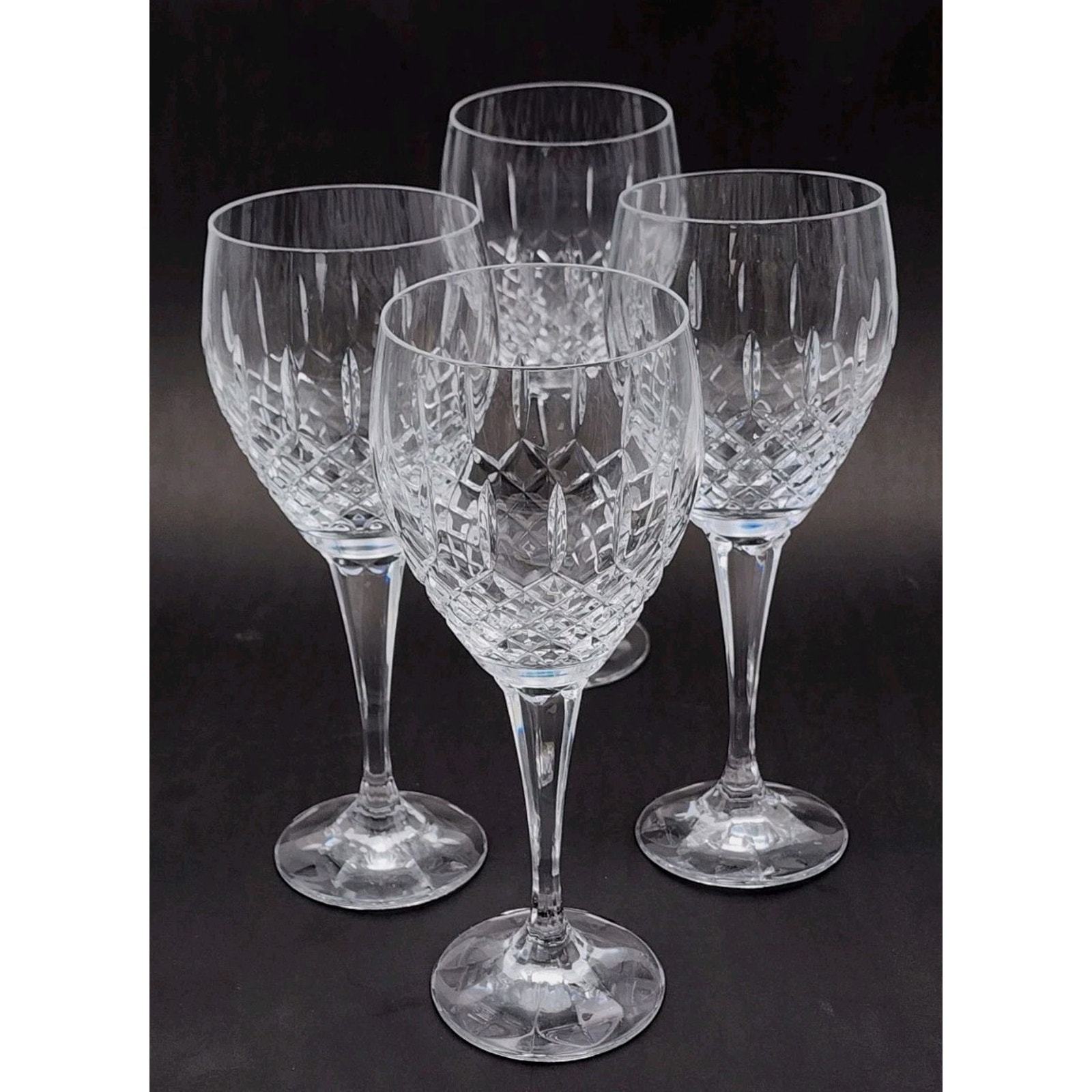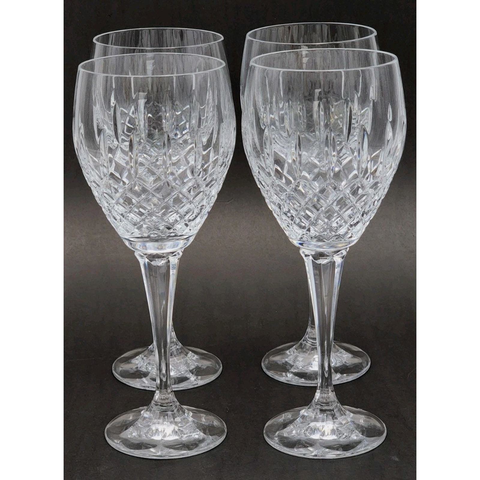 This 4 piece set of Mikasa Coventry crystal Tulip bowl shaped wine glasses / water goblets feature a distinctive criss-cross vertical cut pattern above a band of diamond cuts, with a plain, polished base. This design creates a sparkling, light-reflective quality, giving the glassware a glimmering and luxurious appearance. The crystal is clear and transparent, showcasing its delicate and brittle nature, with a refined ornate aesthetic suitable for formal dining occasions, celebrations, or toasts. The craftsmanship is evident in the precise cuts and polished finish, making each piece appear shiny and sophisticated, ideal as heirloom-quality tableware or decorative serveware.