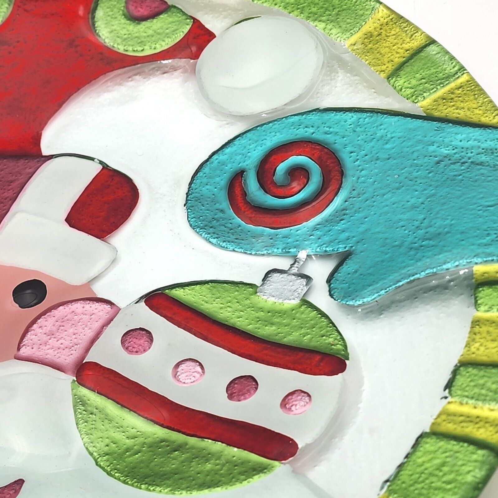 Add some festive cheer to your collection with this Lenox Jolly Santa Christmas Plate. 11.25 inches in diameter. The plate features a hand created glass fusion design that perfectly captures the spirit of the holiday season. The artwork depicts a jolly Santa Claus surrounded by snowflakes and presents, making it the perfect addition to your Christmas decorations.