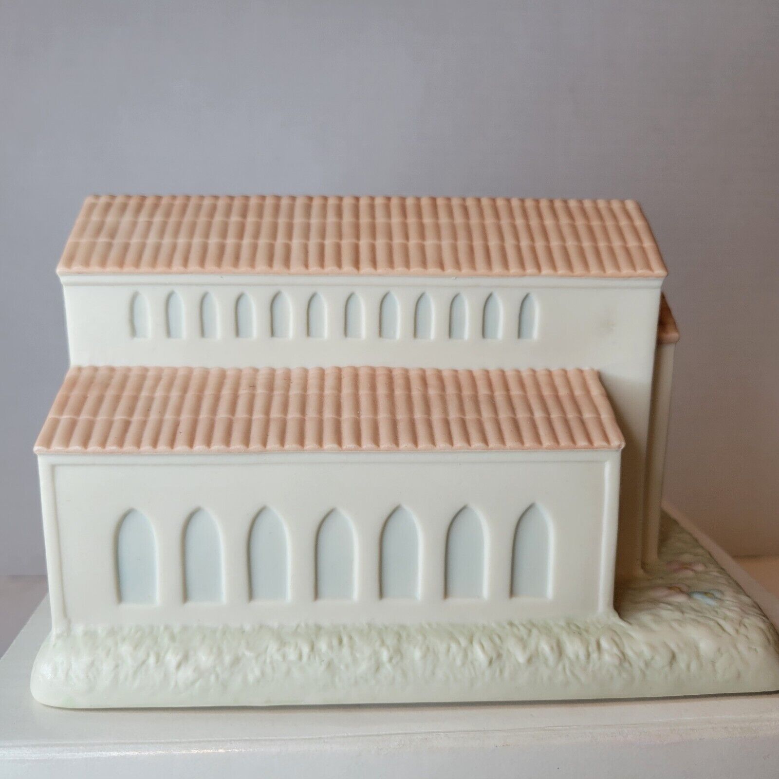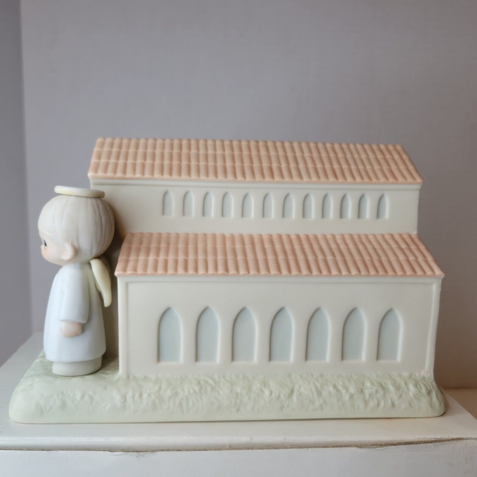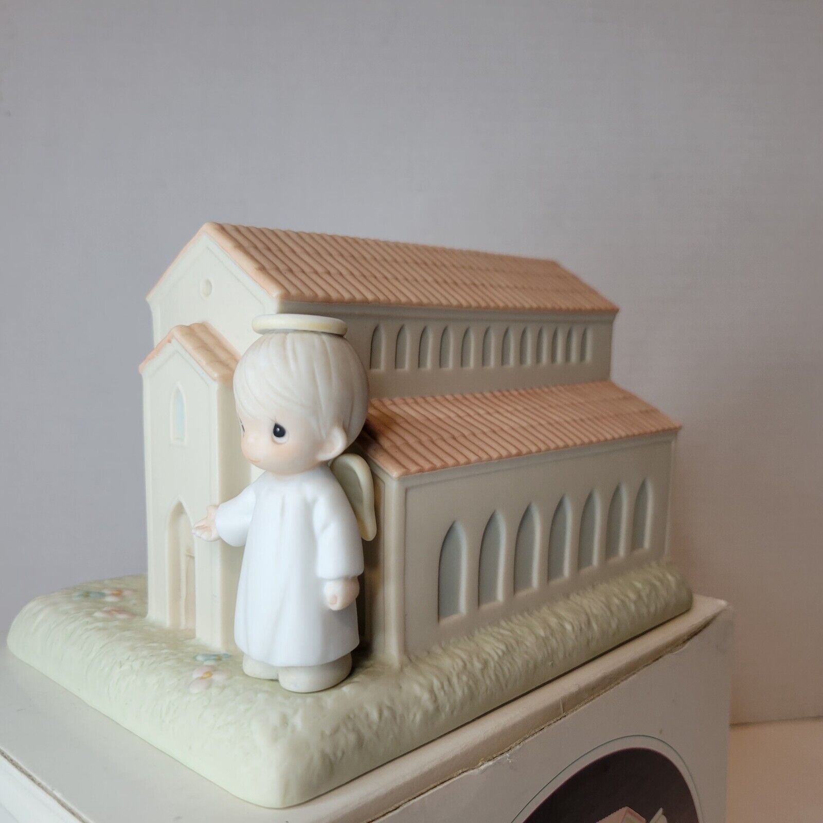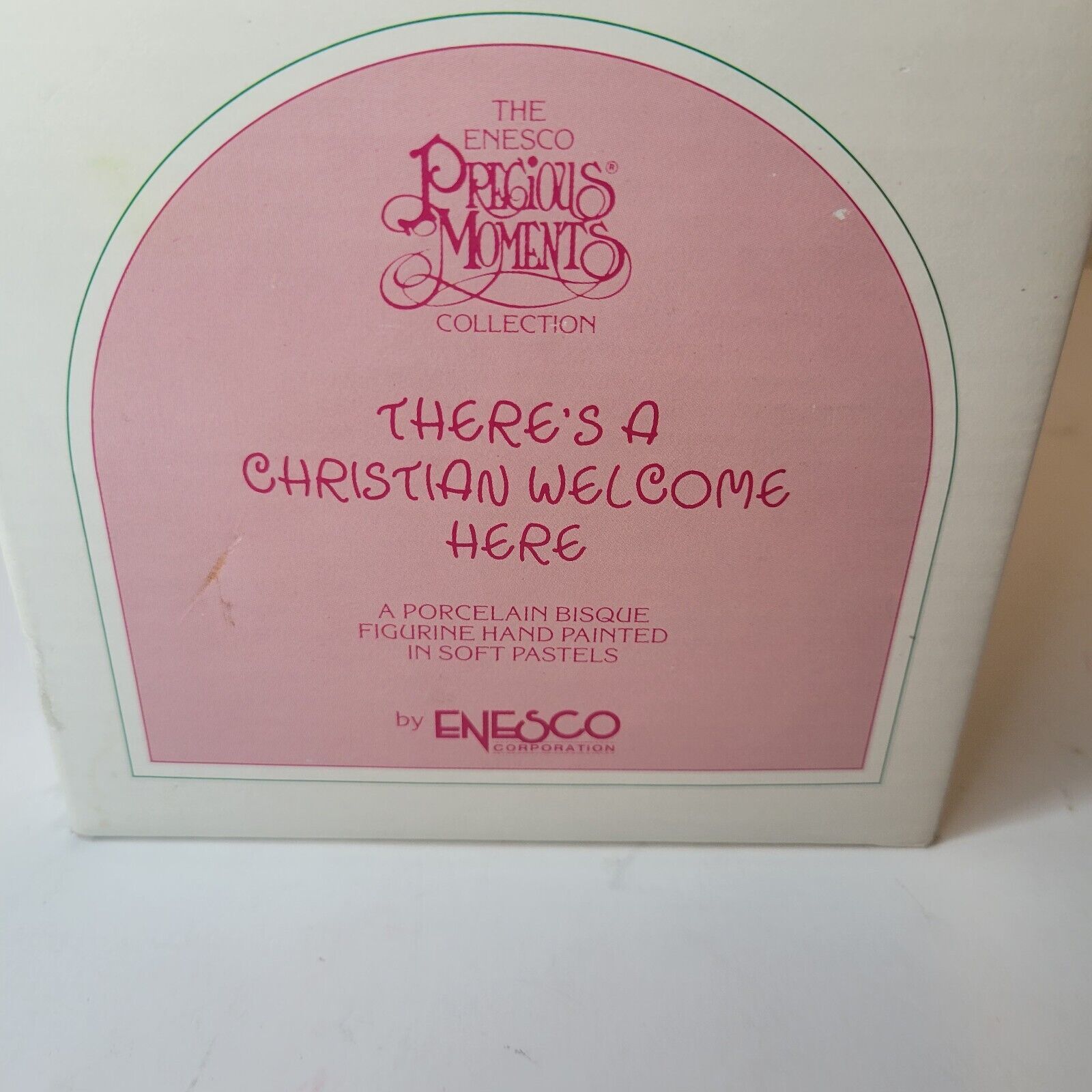 This Precious Moments figurine is a charming addition to any collection. The beige porcelain figurine features a Christian welcome theme, with the inscription "There's A Christian Welcome Here". The figurine was manufactured in 1989 by Enesco as part of their Precious Moments collection.