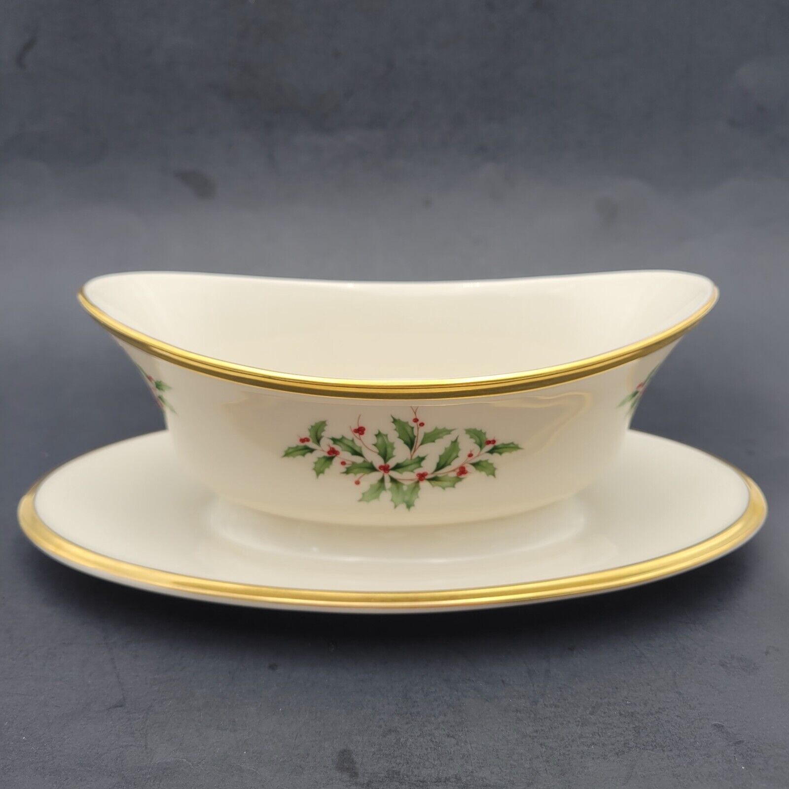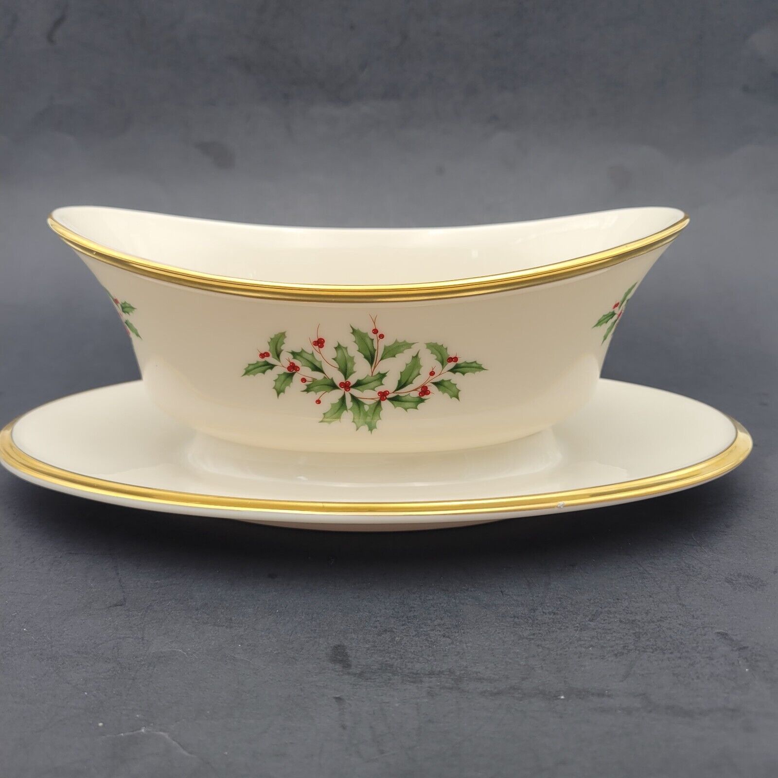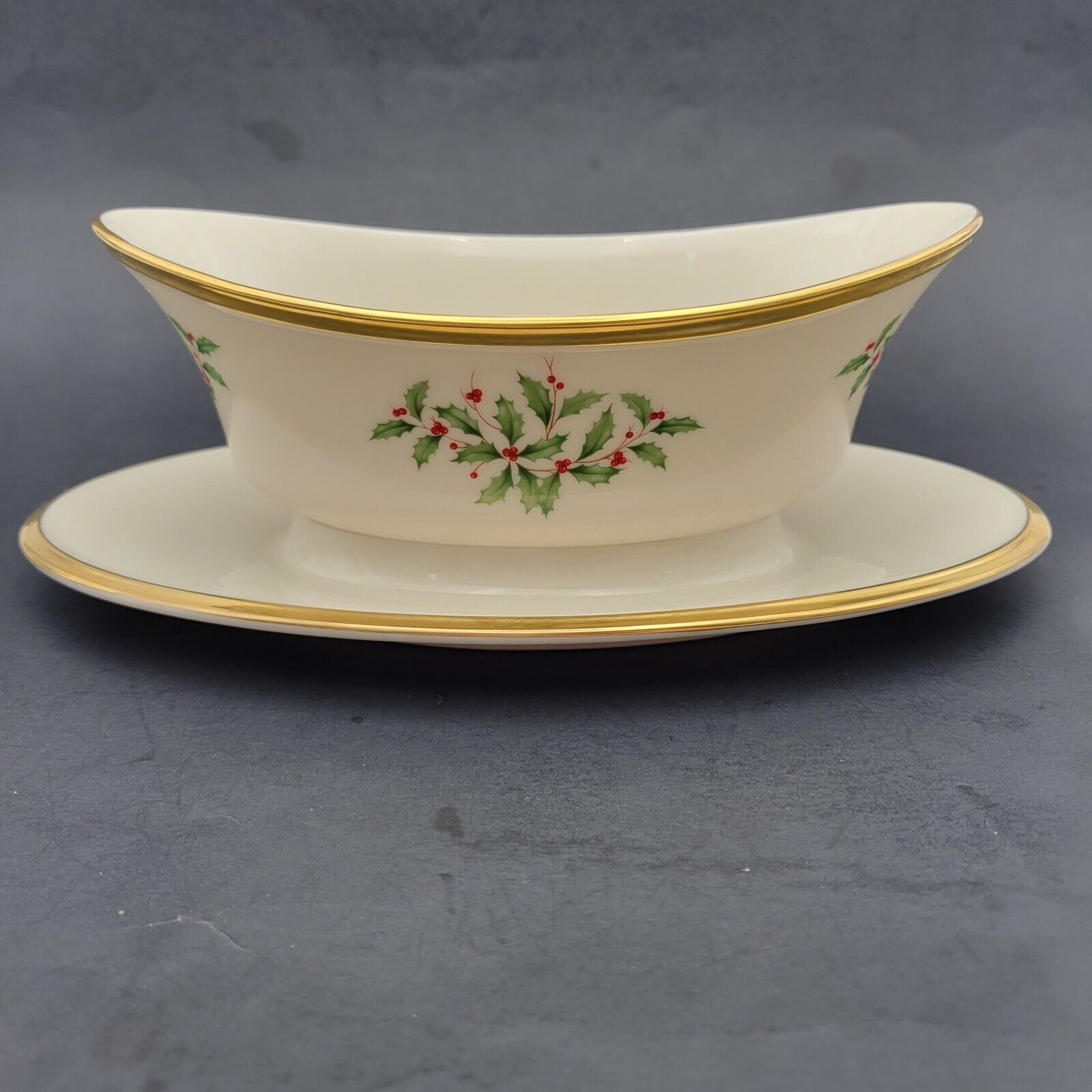 LENOX Holiday Gravy Boat Attached Underplate Holiday Holly Made in USA 24K Gold