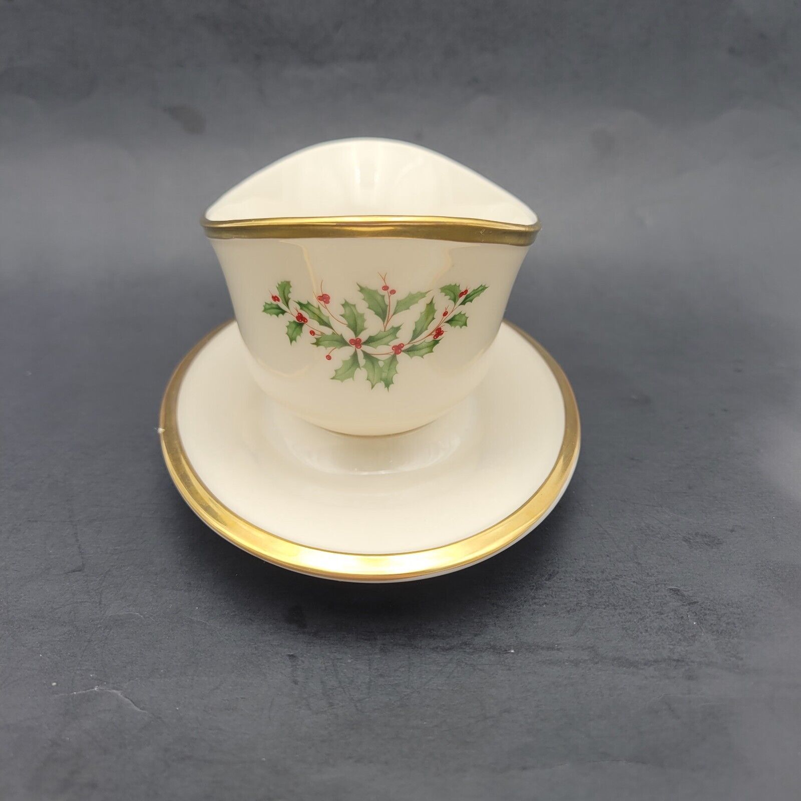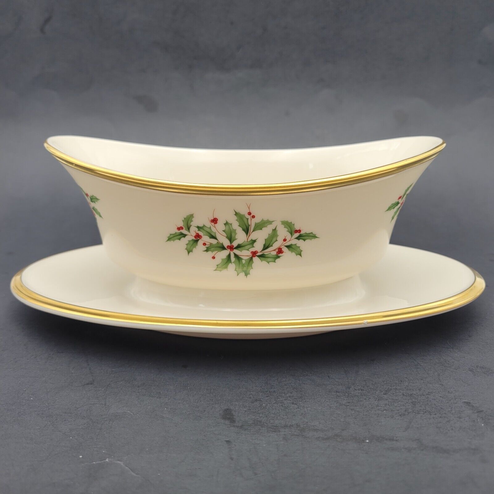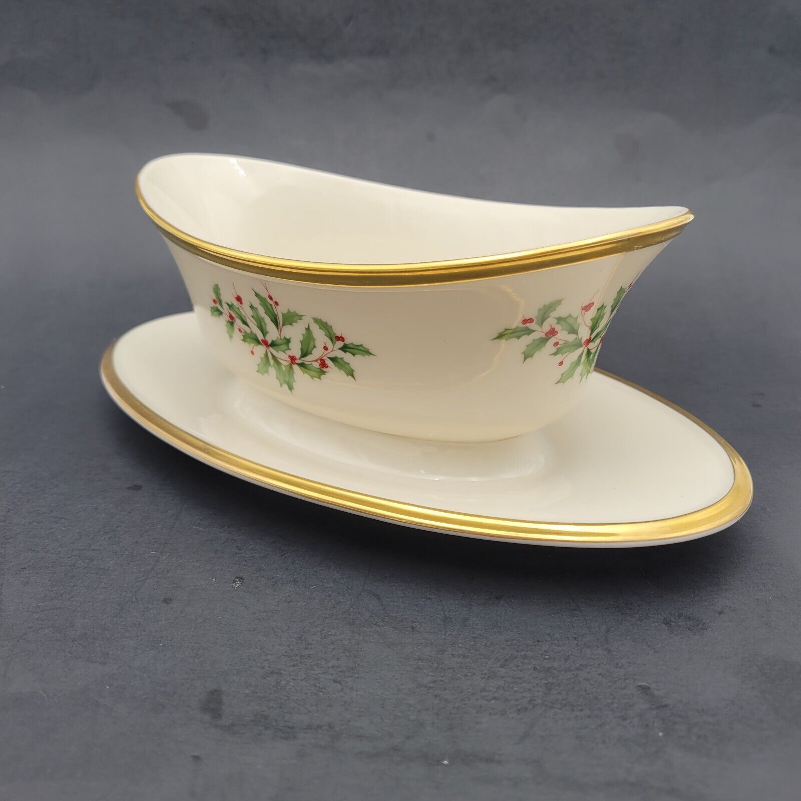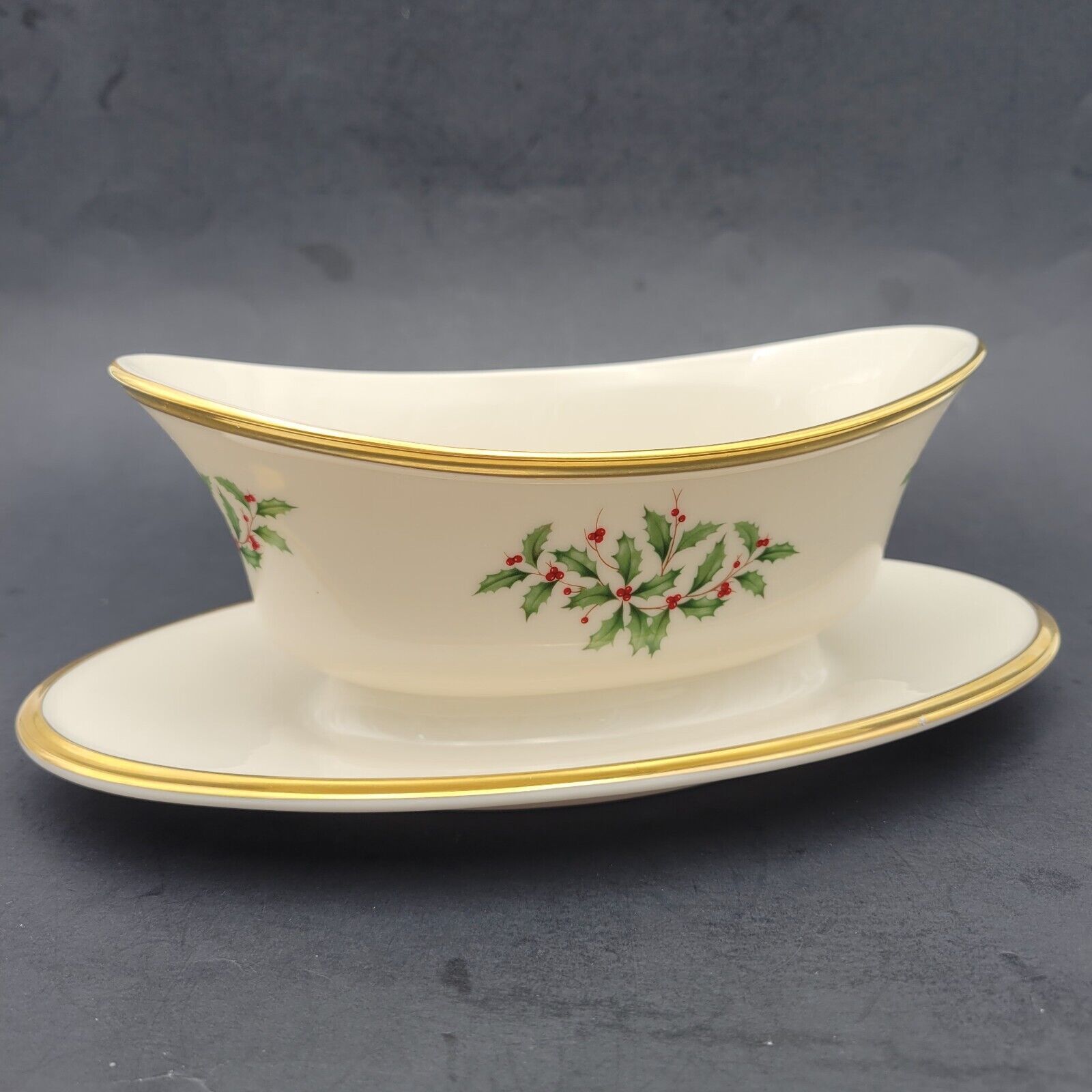 LENOX Holiday Gravy Boat Attached Underplate Holiday Holly Made in USA 24K Gold