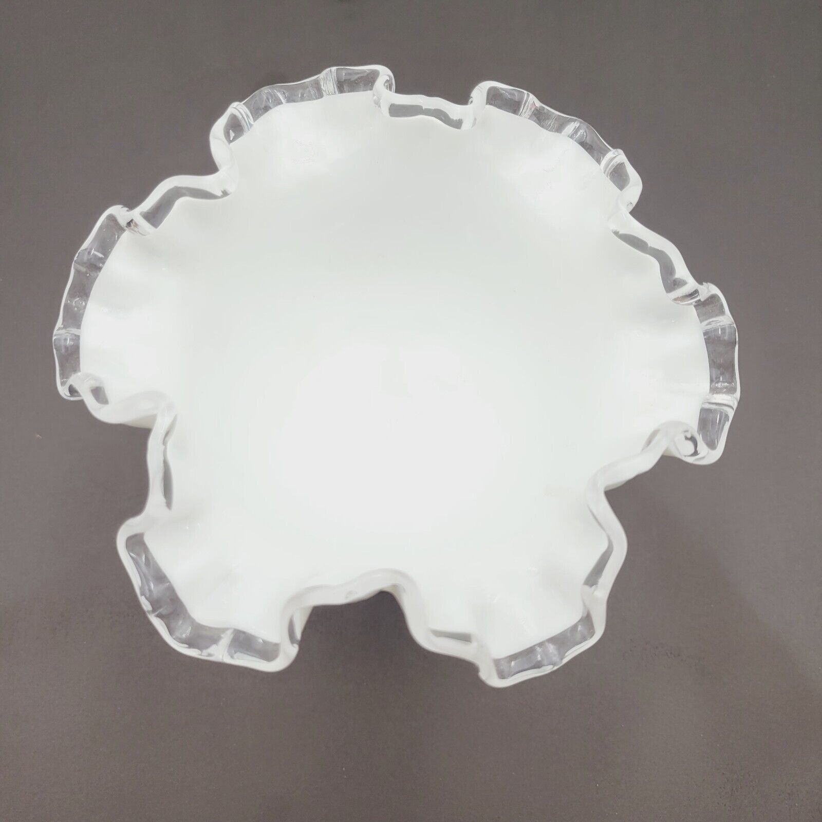 This vintage Fenton candy dish is a stunning addition to any collection. Made of delicate milk glass with a white color, it features a ruffled edge, silver crest, and pedestal base. The Spanish Lace pattern adds a touch of elegance, making it the perfect dish for serving candies or other small treats. The art glass production style and North American origin make this piece unique, while the Fenton brand ensures its quality.