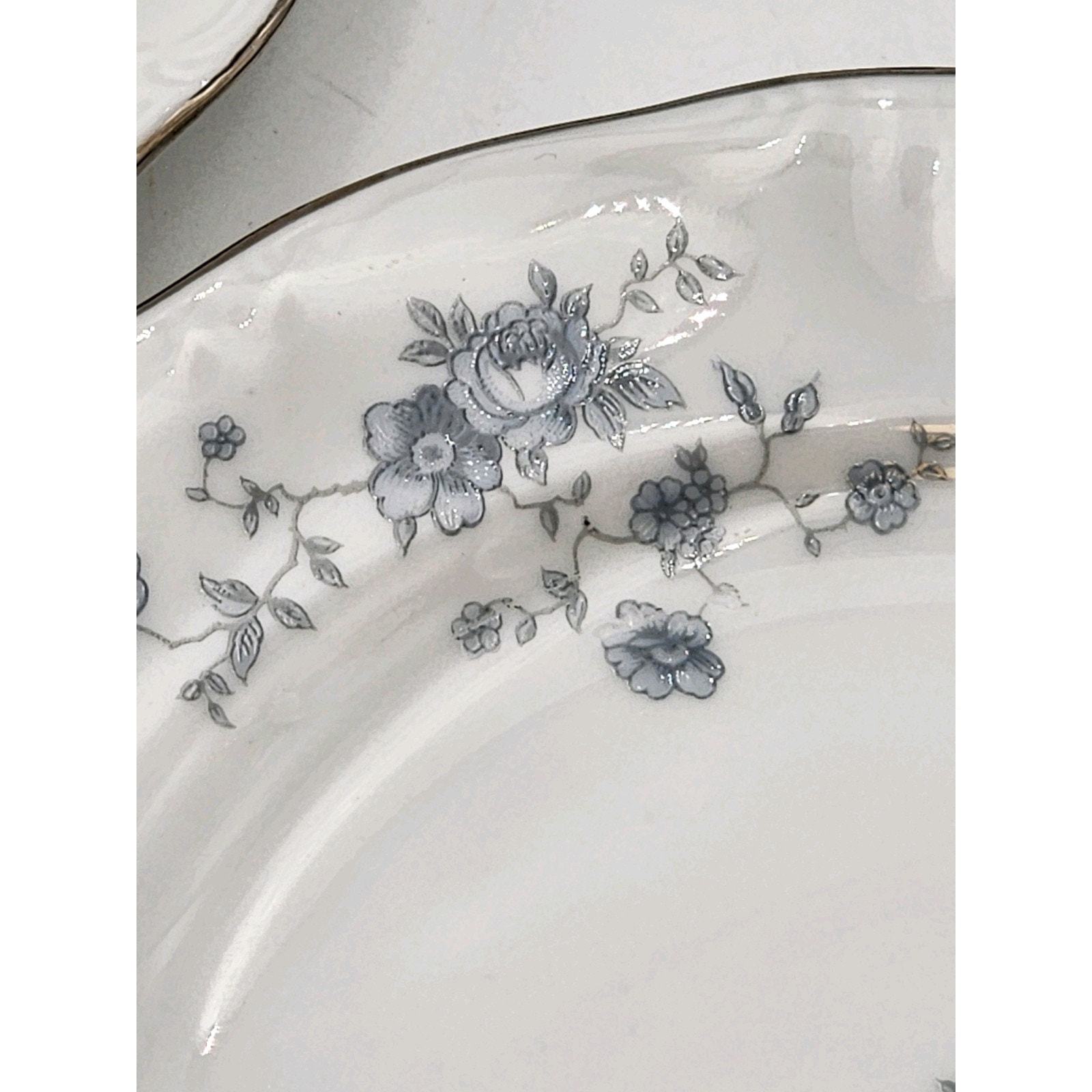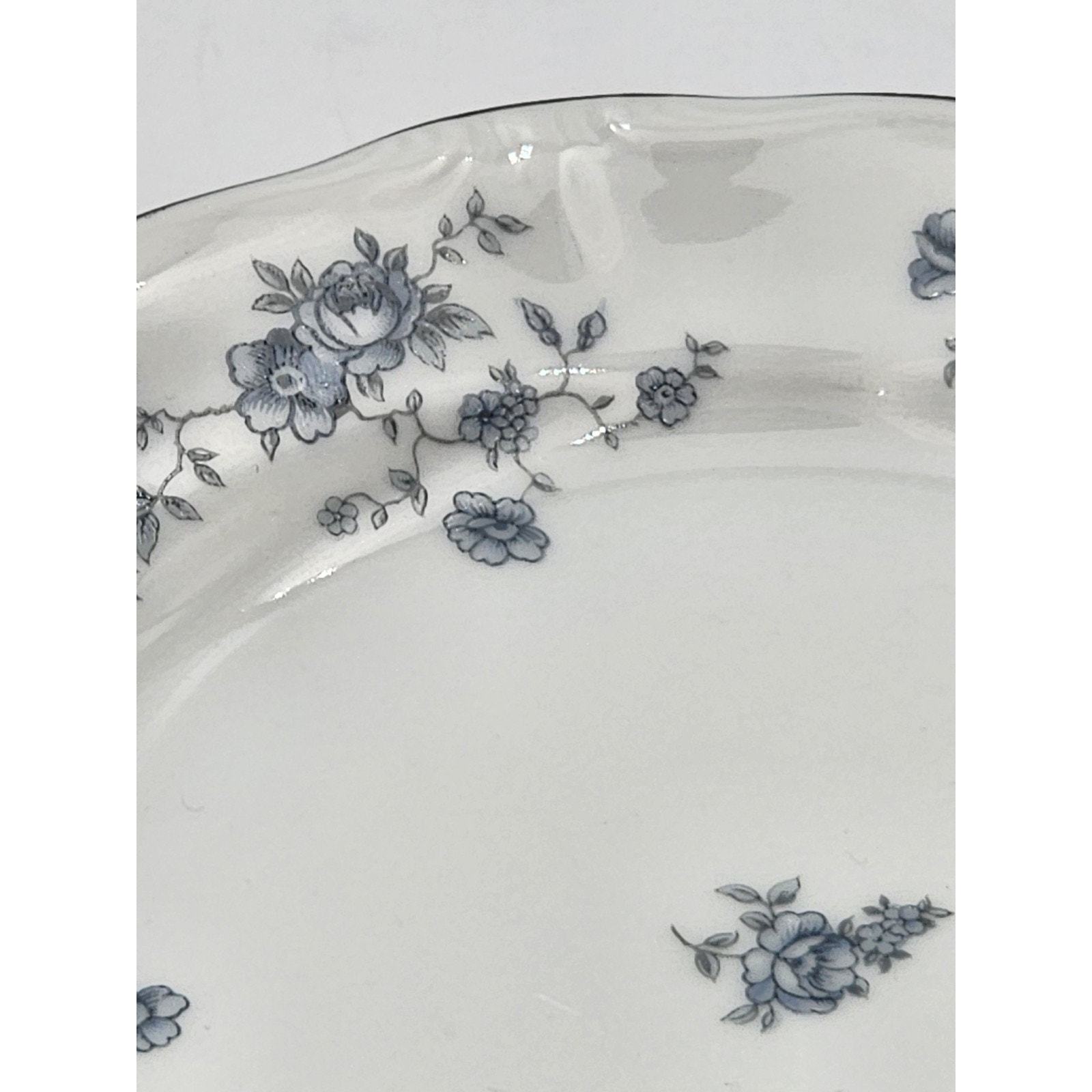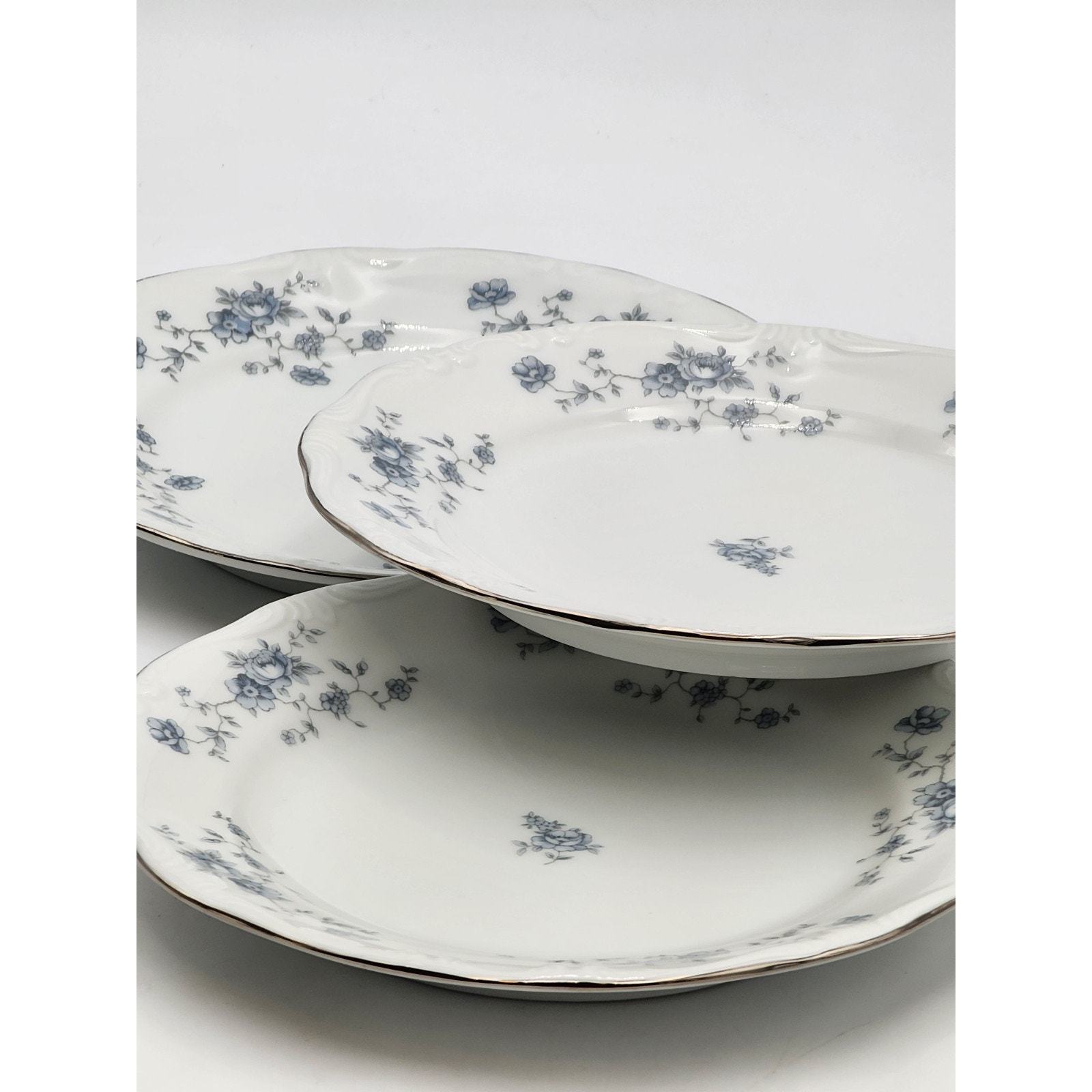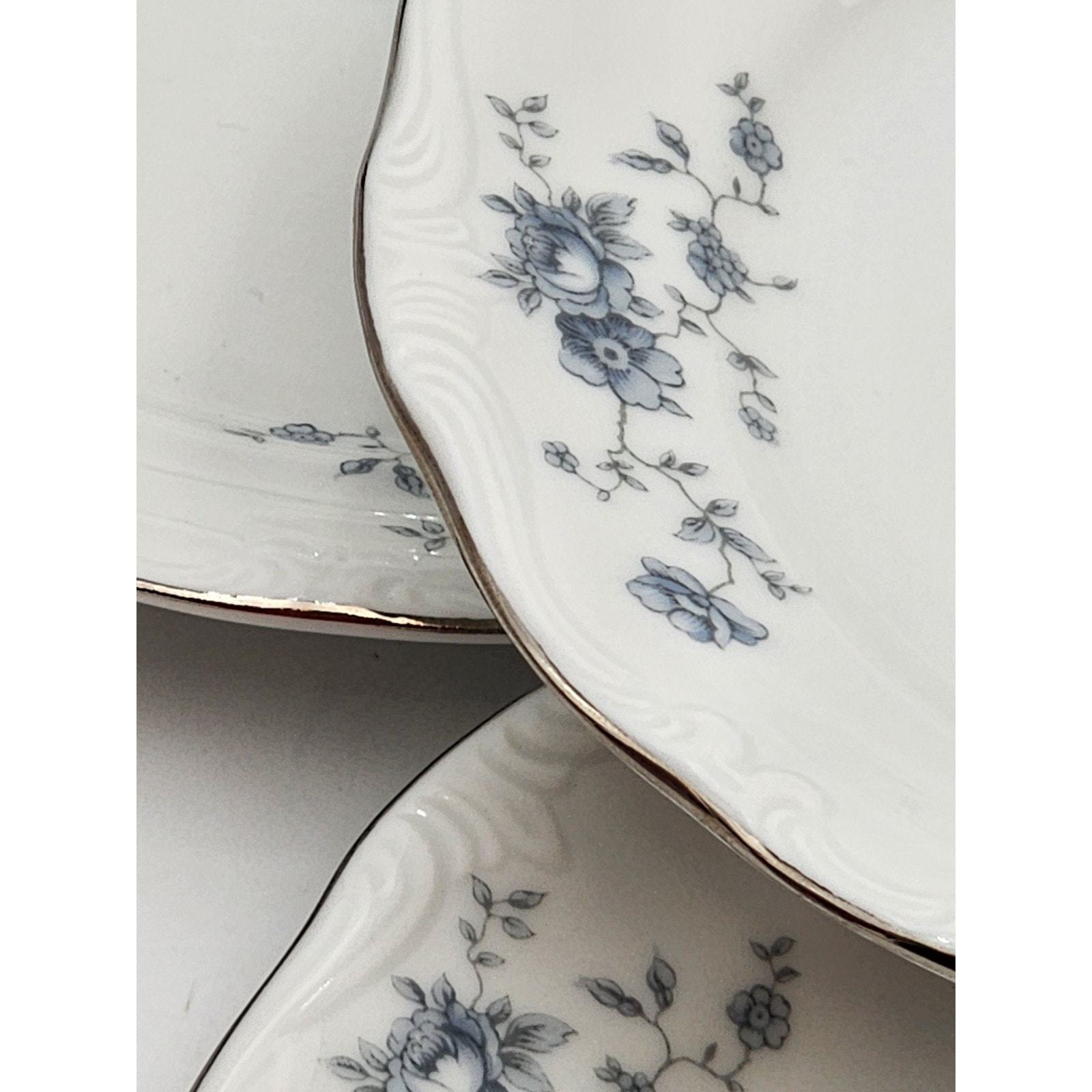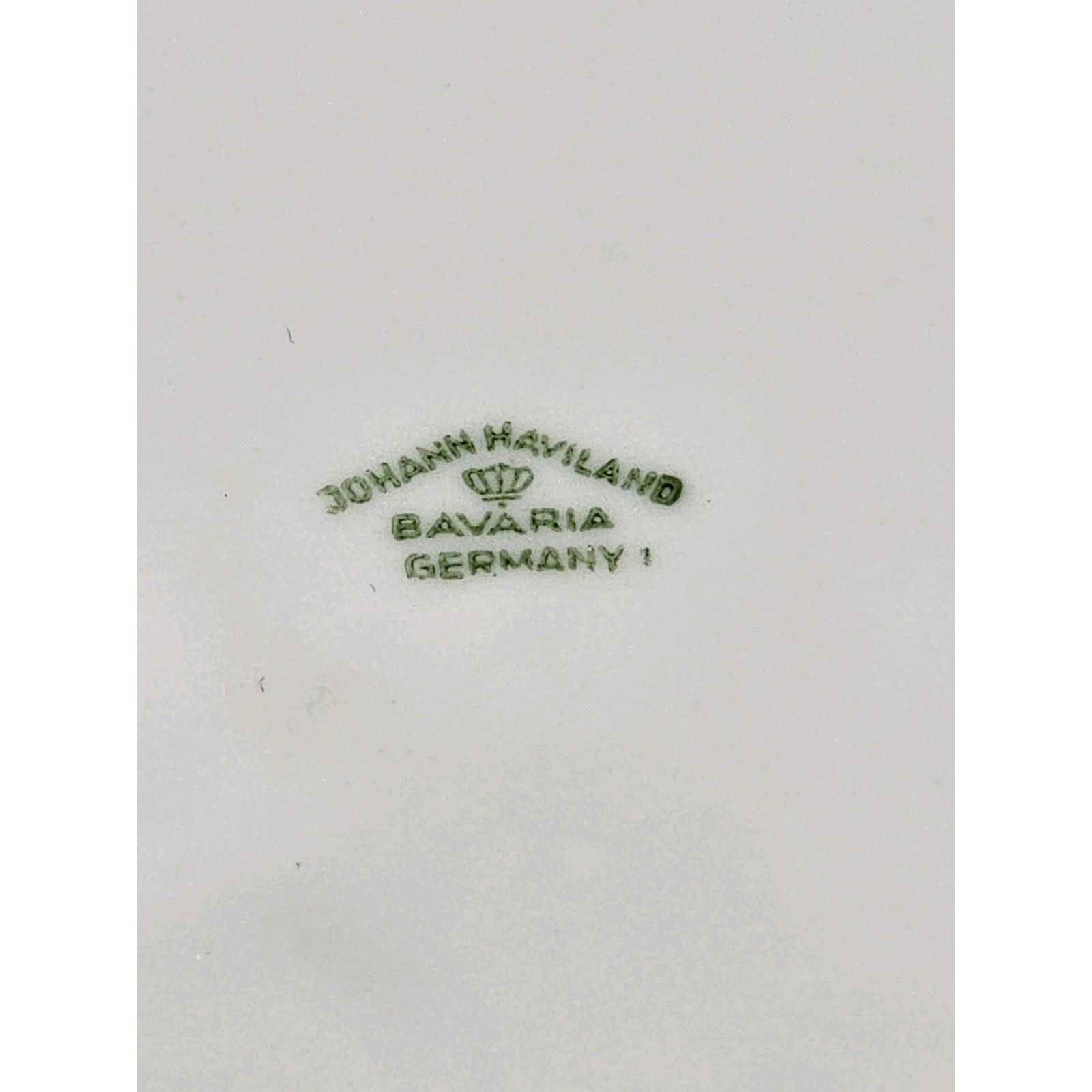 The Johann Haviland Blue Garland bread and butter Plate set of 3 is a vintage collection from Bavaria, Germany, manufactured in 1970. This three piece set features round scalloped porcelain plates with a Victorian style, showcasing a white background with a delicate blue floral garland pattern. The 6.25 " diameter plates are part of the Blue Garland product line and bear a printed backstamp indicating their originality. Hand wash only is recommended for care, and the set is a charming addition for all occasions with a touch of late 20th-century elegance. Ships Fast!