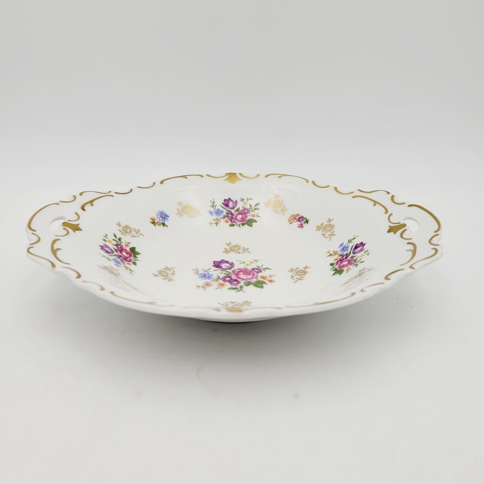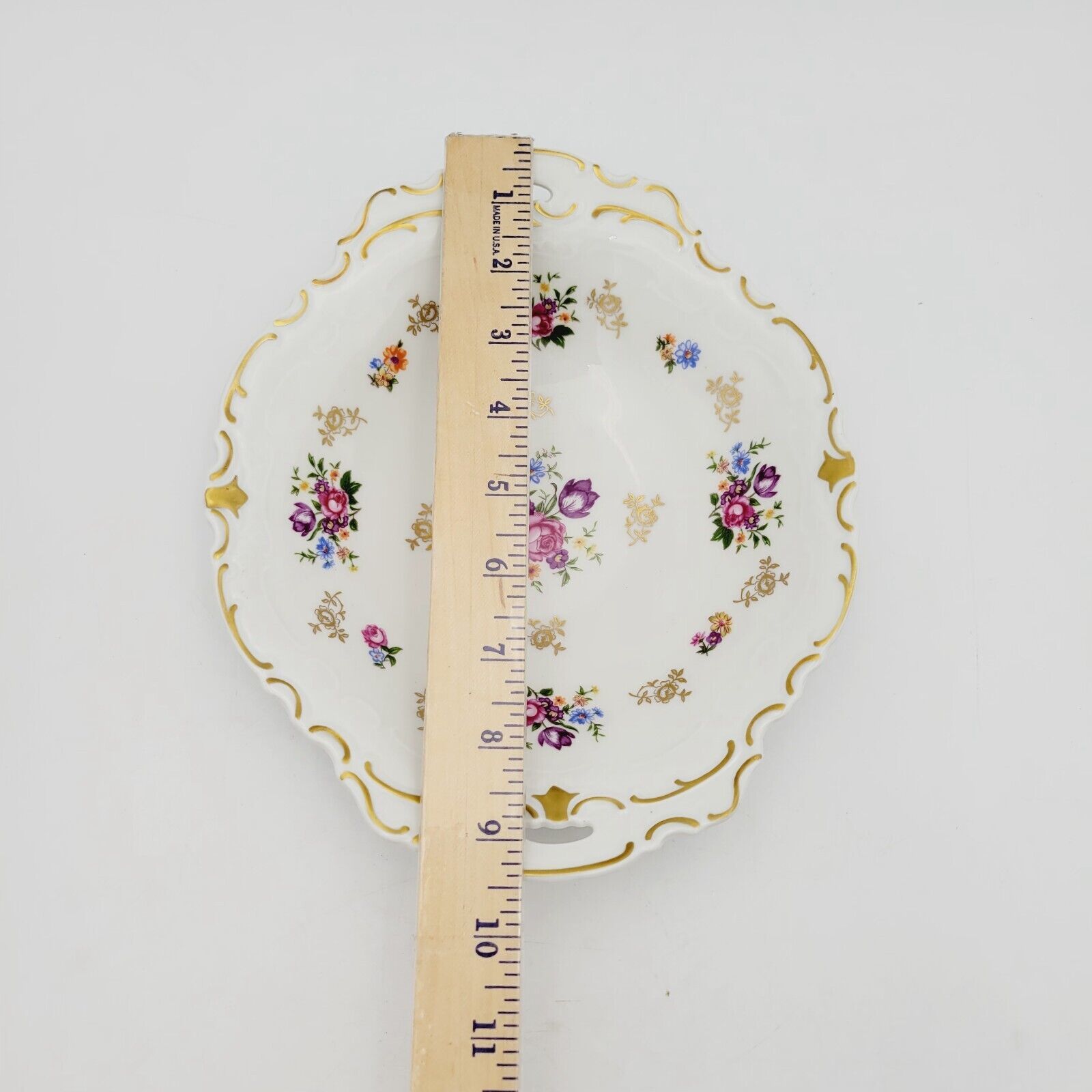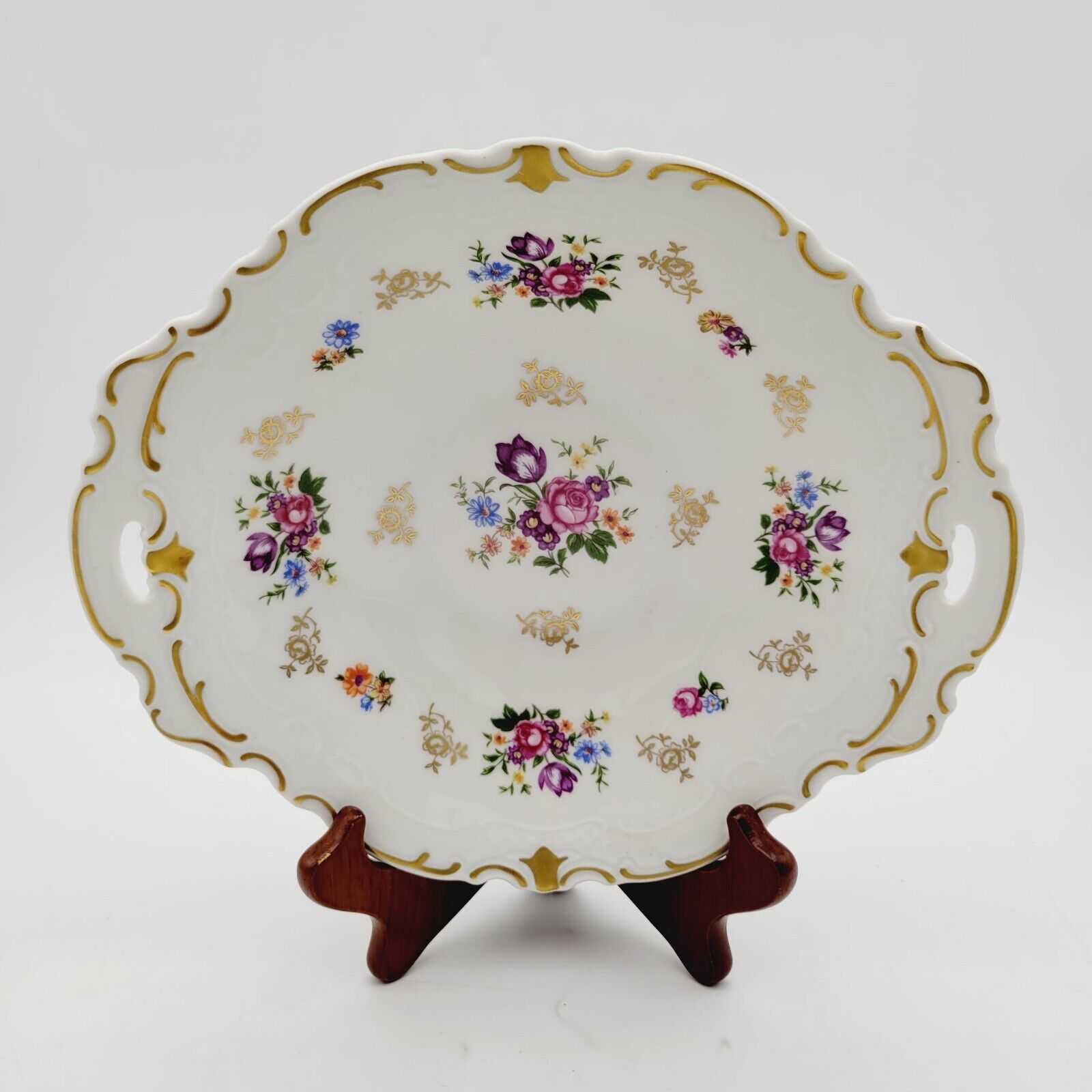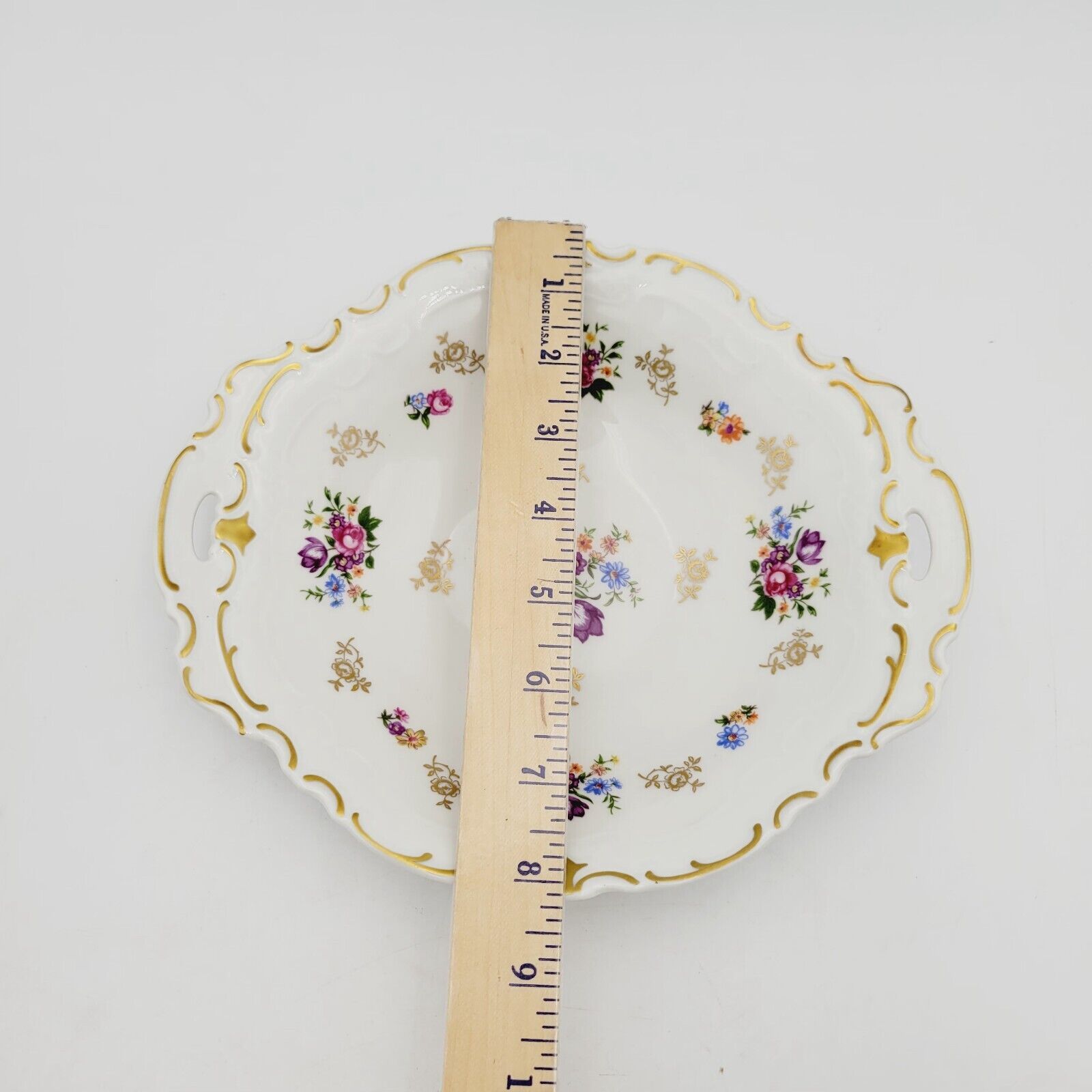 This beautiful oval serving plate from Reichenbach is a stunning piece of porcelain. With a floral vintage pattern in gold, it's perfect for all occasions. Measuring 9.5 inches in length and 8 inches in width, this decorative plate weighs 1lb and has a glossy finish.