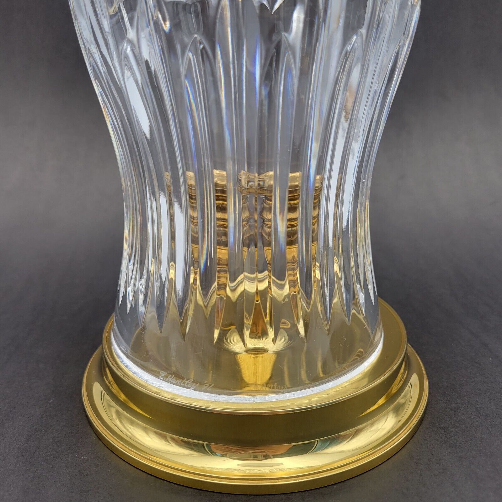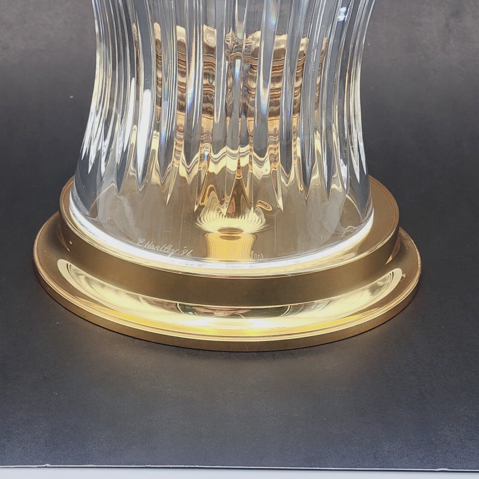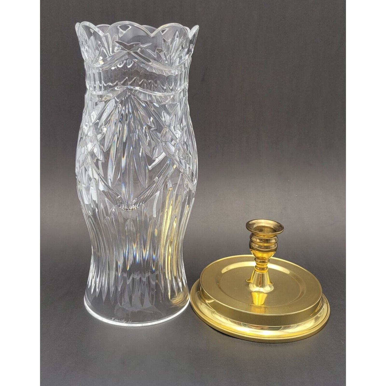 This stunning Waterford crystal candle holder is a true piece of Americana. A part of the 'America's Heritage' collection, this candle holder is a Thomas Jefferson Hurricane Lamp that has been signed by the artist. The clear crystal material adds a touch of elegance to any decor, making it perfect for any occasion. The detailing of the crystal perfectly captures the essence of America, making it a wonderful addition to any patriotic collection. The candle holder comes in its original box, adding to its appeal as a collector's item.